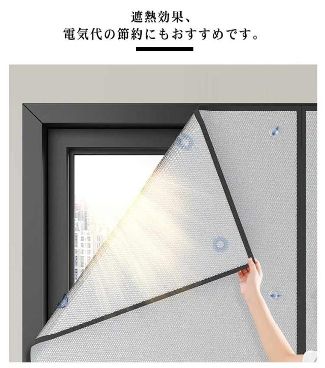 | 粘着剤不要、吸盤で簡単取り付け! エアコンの効率を高めて夏は涼しく冬は暖かい、アルミタイプの断熱シート。 アルミの反射効果で通常の断熱シートに比べ遮熱・断熱性能がアップ。 UVを99%カットし、カーテンや家具の色あせを防ぎます。 遮熱効果、電気代の節約にもおすすめです。 | |
