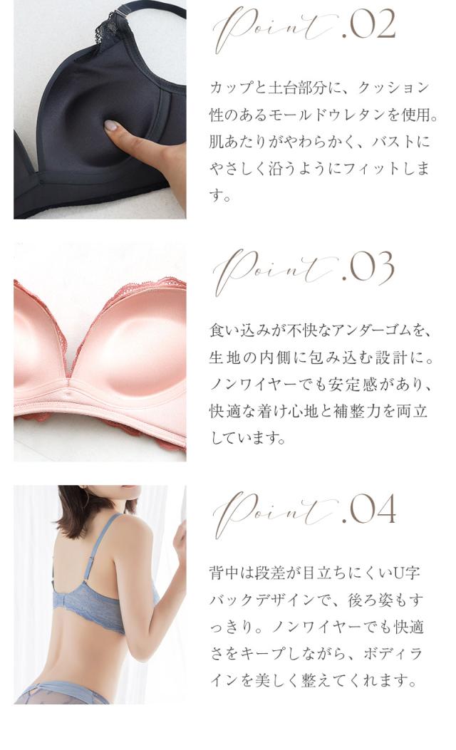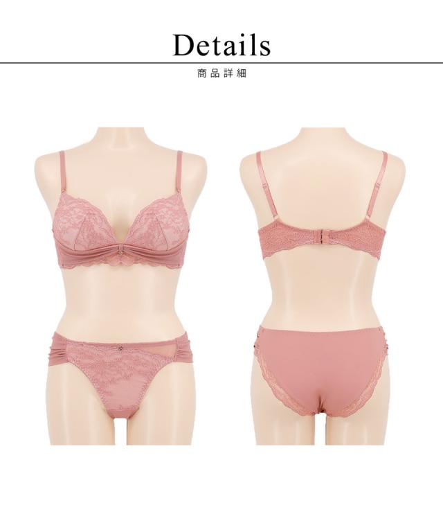 ブラ&ショーツ / 計2点セット 日常に愛らしさをともす、ラヴィーナブラ ノンワイヤーで楽な着け心地なのに、きちんとスタイルアップ。 サイズごとにカップ設計を細かく調整し、黄金比を意識した理想のボディラインへ。 ふれるたび、気持ちまでやさしくほどけていく。 繊細なレースがそっと肌になじみ、まるで深呼吸するように、心までふんわりと軽くなる。 それは、ひとひらの花を纏うような感覚。 自分を大切にしたい朝も、少しだけ自信がほしい夜も——。 いつもの私に、そっと、ときめきを灯してくれる一着です。 【こんな方におすすめ】 ・バストにふんわり丸みを持たせて、全体をすっきり見せたい方 ・ノンワイヤーの楽さと、美しいスタイルアップを両立させたい方 ・バストの高さと自然な丸み、どちらも叶えたい方 ■ふっくら盛ってすっきり整える ・バストの横広がりを抑え、中央に寄せる設計で自然な谷間メイク ・サイズに合わせたカップ採用で、バストの黄金比を実現 ・肌面がなめらかな独自のカップ台で自然な上向きバストに ・U字バックデザインで背中もすっきり \お揃いレースのショーツは選べる2タイプ♪/ ・フルバックタイプ…デイリー使いにおすすめなベーシックデザイン ・レースバックタイプ…ラインが出にくく、ムレにくい快適設計 ≫ ギフトラッピングはこちら ≪ | |