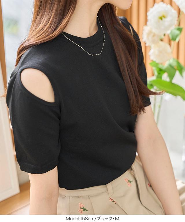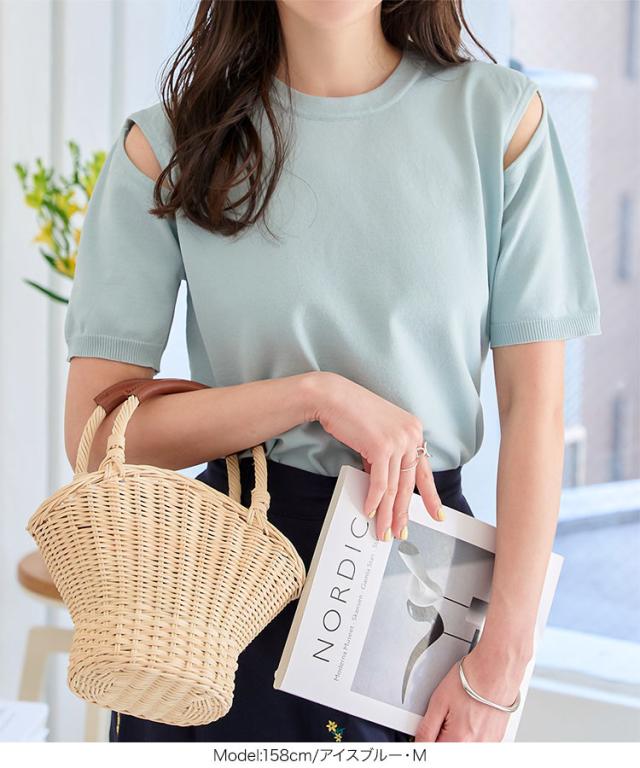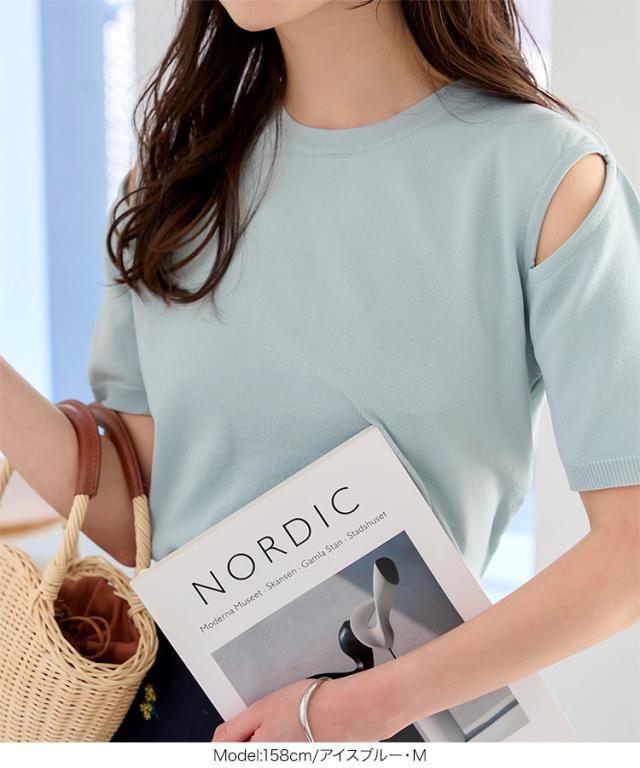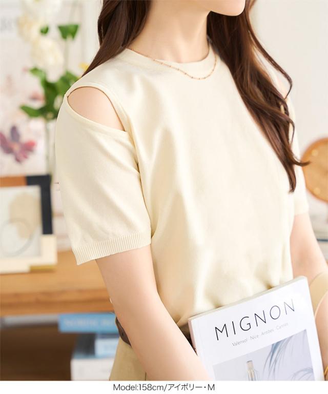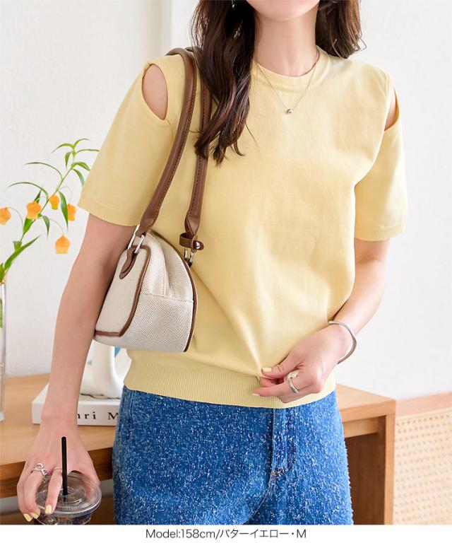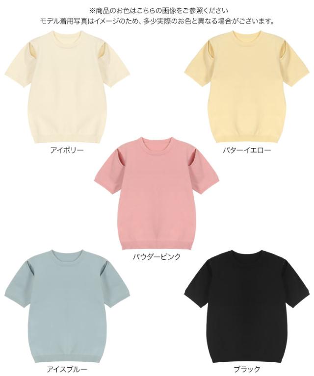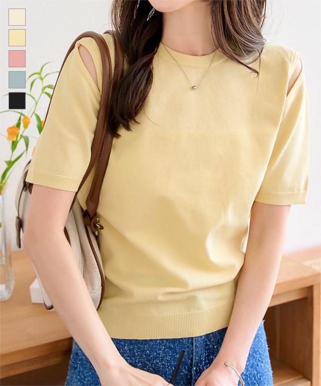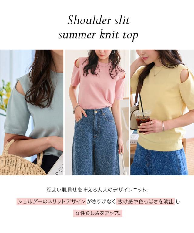 春新作 ショルダースリットサマーニットトップス N1187 入荷済 レディース 20代 30代 40代 トップス ニット サマーニット クルー クルーネック スリット コットンライク ニュアンスカラー 白 イエロー ピンク ブルー ブラック ベーシック シンプ