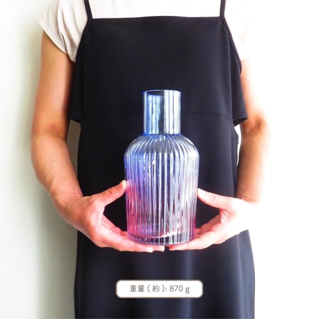ブルー、パープル、ピンク、上下で移り変わる色調は同系色の花々と相性抜群。華やかで品のある雰囲気に仕上がります。口径が狭いので活けた花が集約され思わず目が惹かれる姿はディスプレイのアイキャッチに最適。ガラス素材と配色により驚くほどの透明感が生まれ、気品や優雅さの中に爽やかでスッキリとした印象に心奪われる。