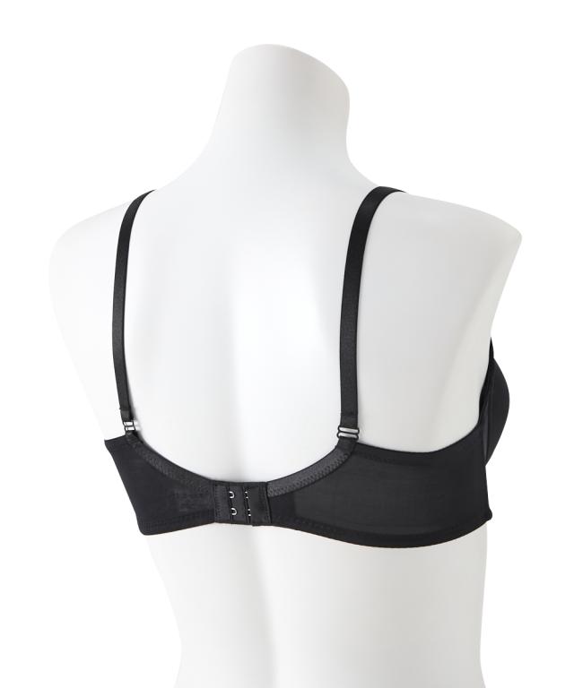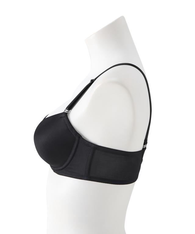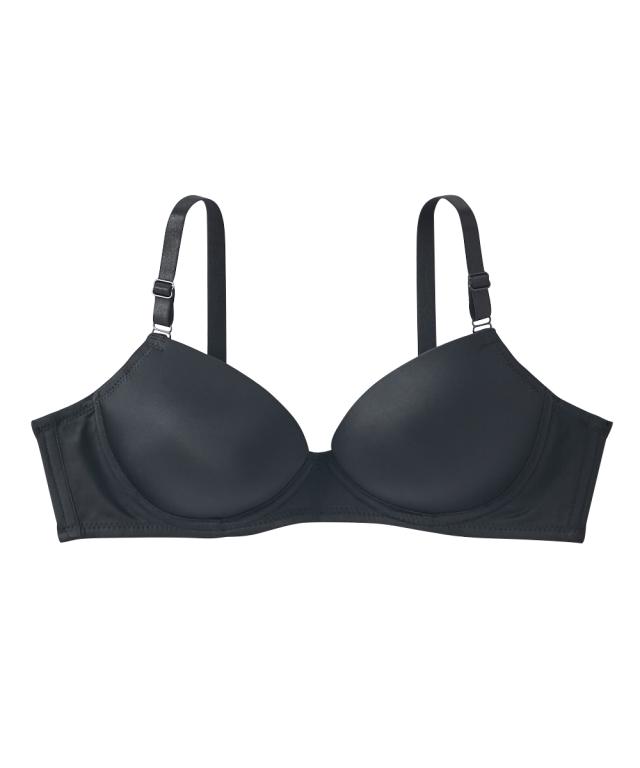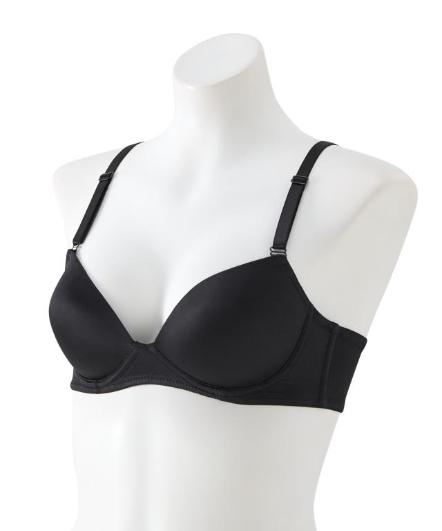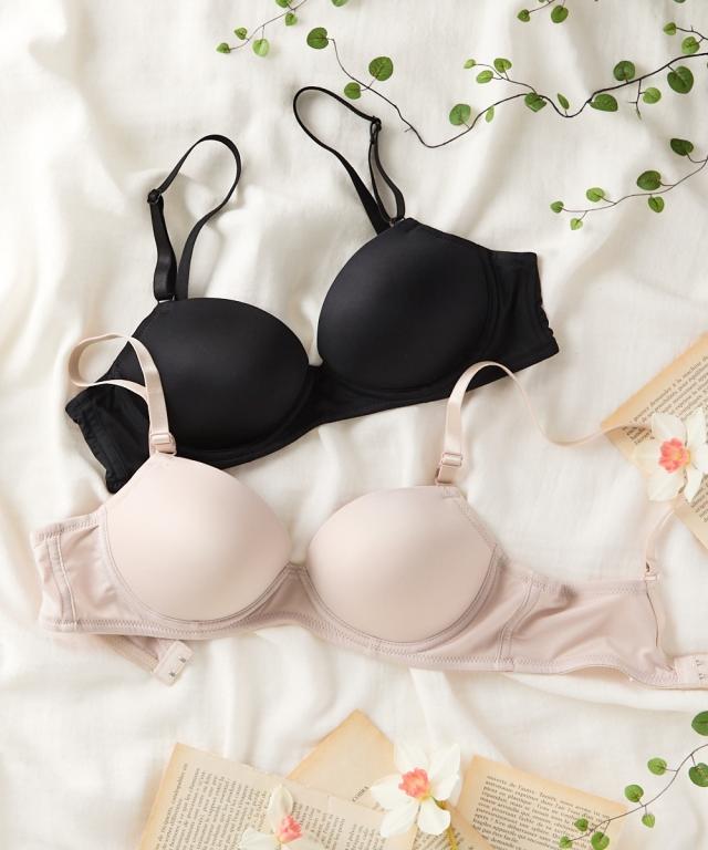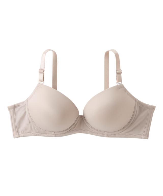 Tシャツやニットにひびきにくい!シームレスブラジャー ・アウターにひびきにくいシンプルなノンワイヤーブラ ・シームレスのモールドカップで取り外しできるパット付き カップ裏リフトでノンワイヤーでもきれいにバスト寄せる仕様