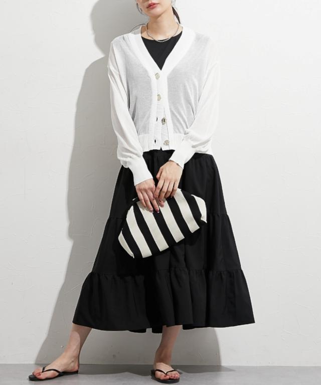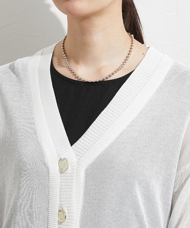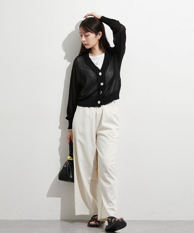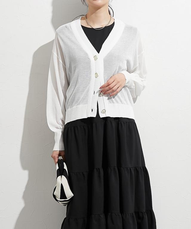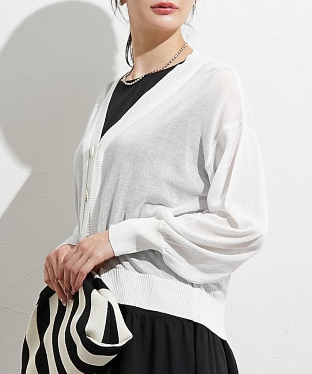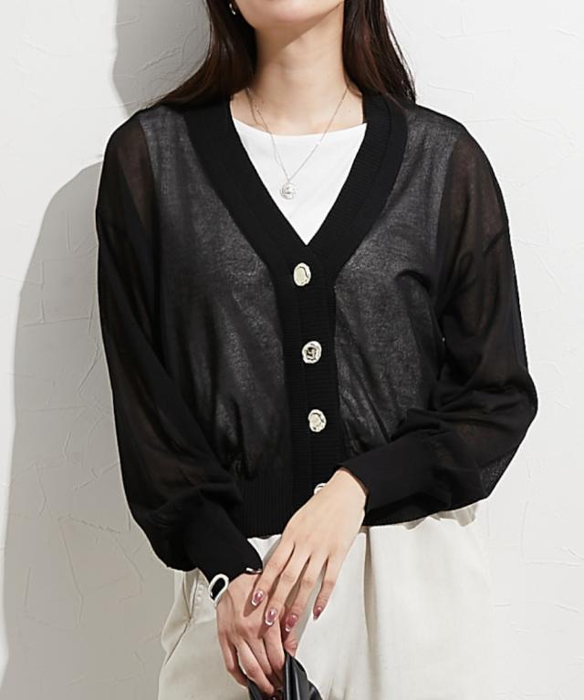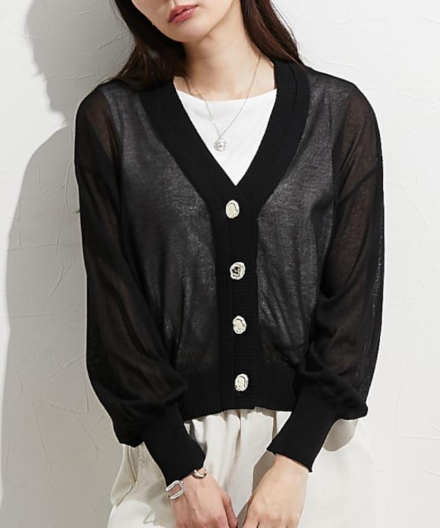 ■デザイン 重ねたような前立てデザインが特徴のシアーカーデ。すっきり見えるVネックなのでインナー合わせでコーデも楽しめます。涼し気な大きめのシルバーボタンも今年人気のディティールです。 ■素材 レーヨン・ナイロンのしゃりっとした素材感が特徴。肌触りが良く夏にも使いやすい素材感。 ■おすすめのスタイリング インナーキャミにさっとはおってネックレスを合わせるとトレンド感のある着こなしが即完成します。シアーなのでワンピースにはおっても抜け感がありおすすめです。