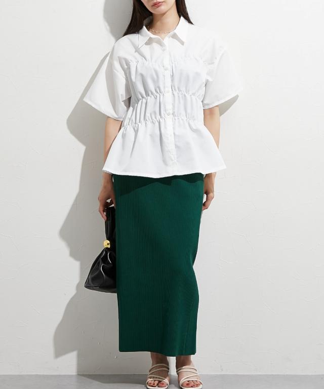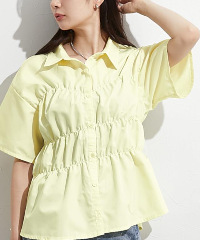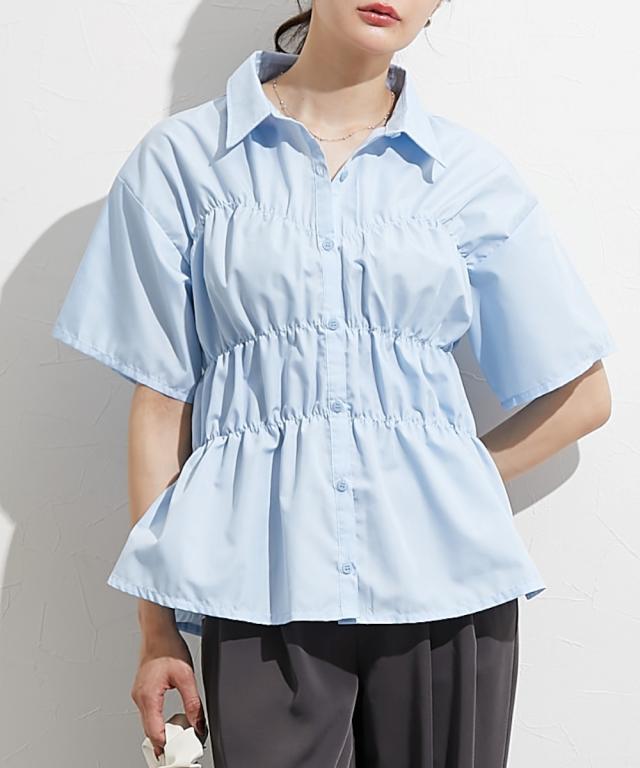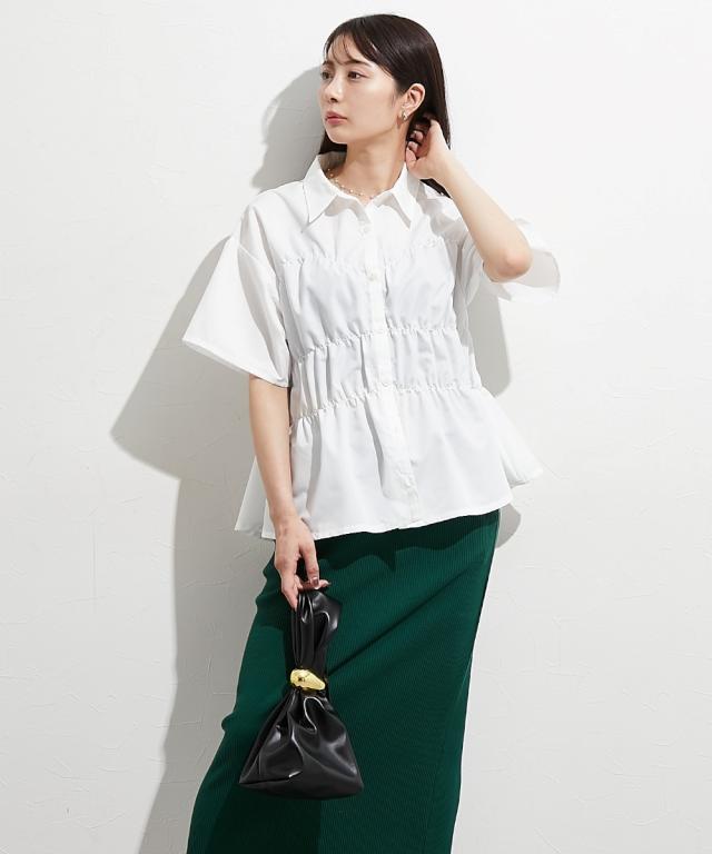 ■デザイン シャーリングデザインがかわいいデザインシャツが入荷しました。レギュラーシャツにビスチェ風のシャーリングゴムを入れているので着ぶくれせずすっきり着映えするデザインがポイント。ドロップショルダーで肩や腕周りはややゆったり目仕様なので動きやすくらくちん! ■素材 綿混のさらりとした肌触りの生地を使用。これからの季節に使いやすい薄すぎない素材です。 ■おすすめのスタイリング 裾を出して着用するとペプラムっぽく少しフレアになるデザインなのでナロースカートやワイドパンツなど幅広いボトムとコーデしやすいトップスです。衿元のボタンを開けて抜け感もだせるおすすめアイテムです!