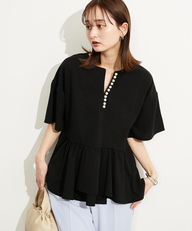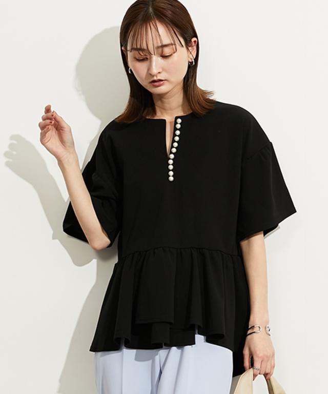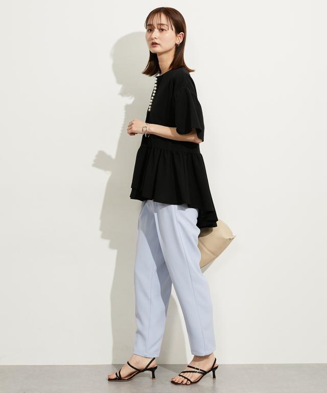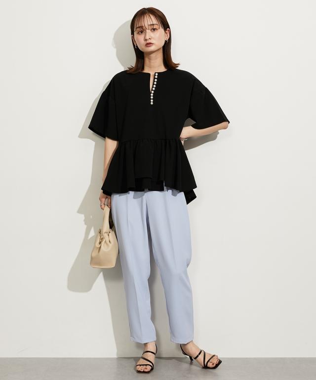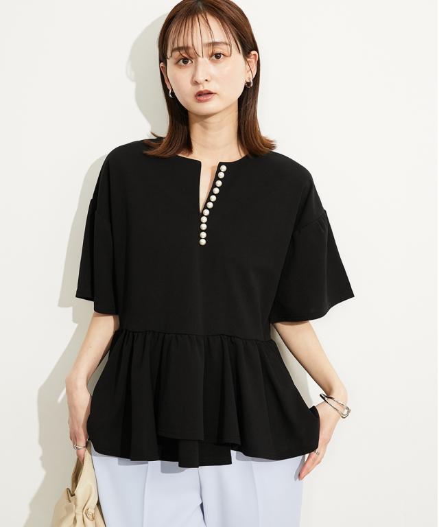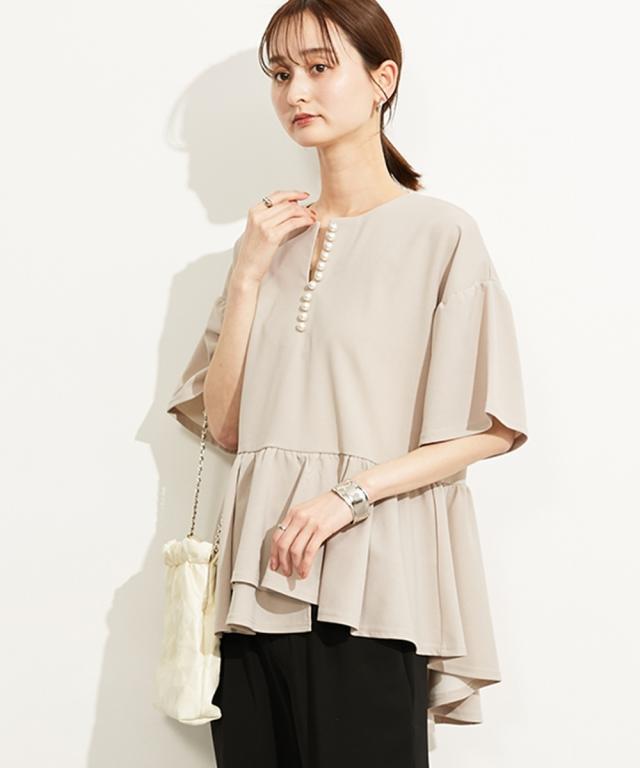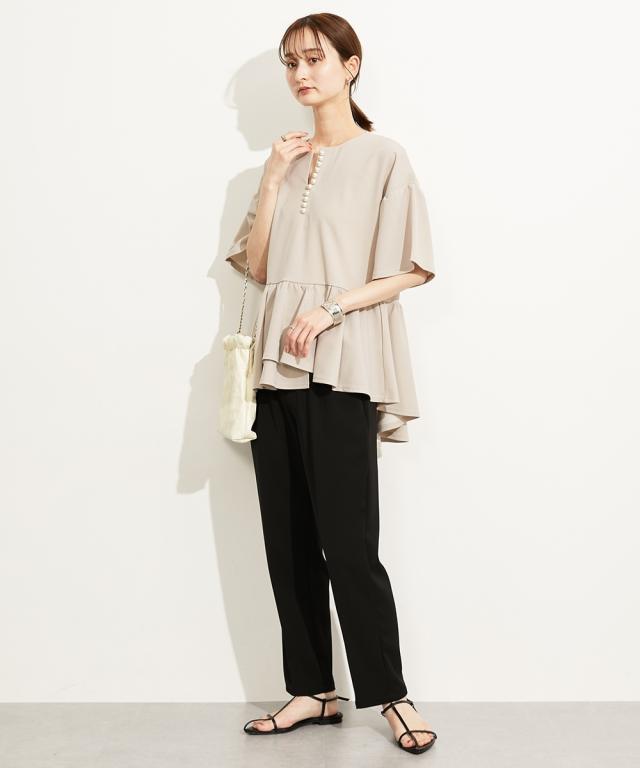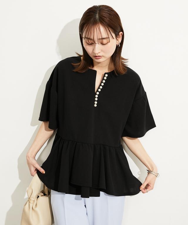 ■デザイン パール調ビジューがかわいいフレアブラウス。上品なシルエットでオンからオフまで着まわしやすいデザインがポイントです! ■素材 夏にうれしい高機能素材。UVカット・接触冷感・吸汗速乾機能付きなので汗ばむ季節に着まわしやすいアイテム。ネットに入れて洗濯機洗いOKなのもうれしいアイテム。 ■おすすめのスタイリング 袖のフレア感や裾の切替など、体型カバーにもうれしいデザイン。ベーシックなテーパードパンツやリブナロースカートもきれいに決まります。