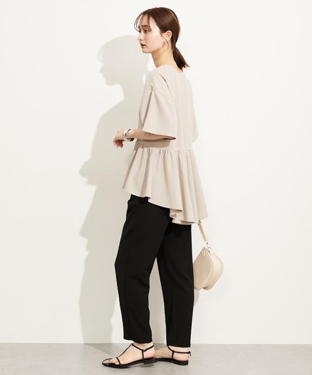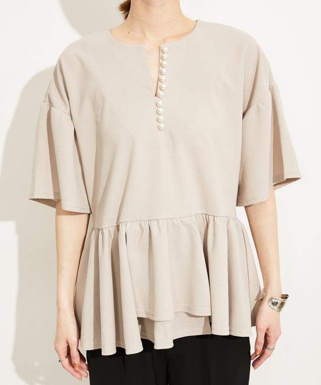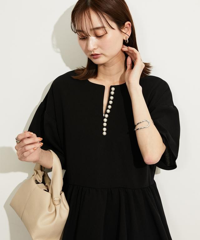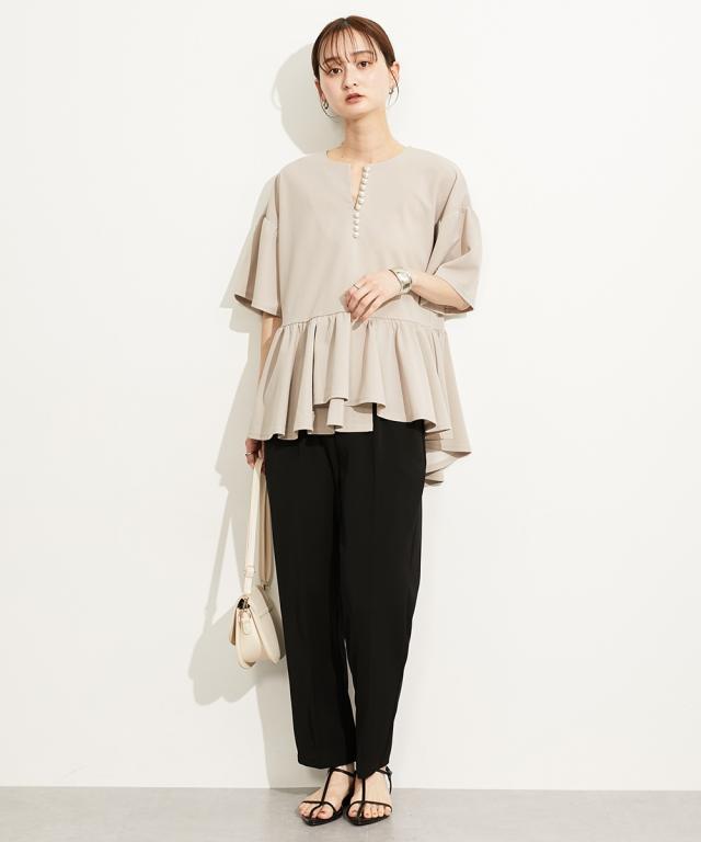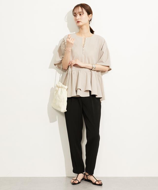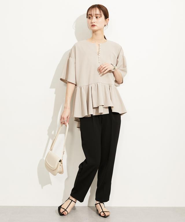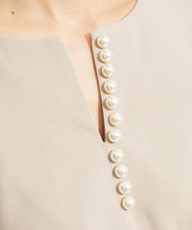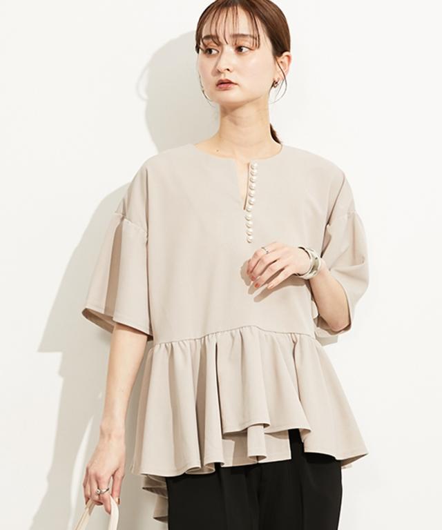 ■デザイン パール調ビジューがかわいいフレアブラウス。上品なシルエットでオンからオフまで着まわしやすいデザインがポイントです! ■素材 夏にうれしい高機能素材。UVカット・接触冷感・吸汗速乾機能付きなので汗ばむ季節に着まわしやすいアイテム。ネットに入れて洗濯機洗いOKなのもうれしいアイテム。 ■おすすめのスタイリング 袖のフレア感や裾の切替など、体型カバーにもうれしいデザイン。ベーシックなテーパードパンツやリブナロースカートもきれいに決まります。
