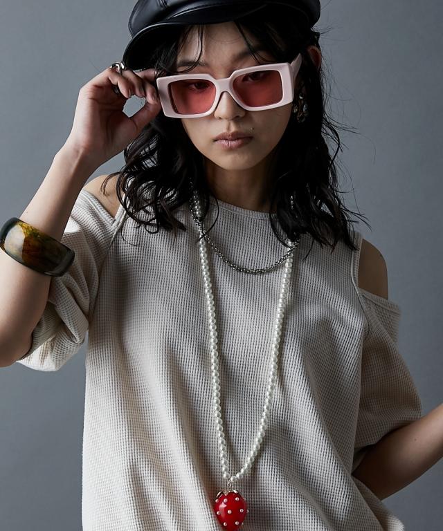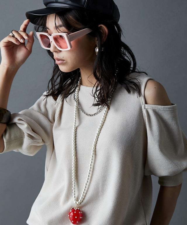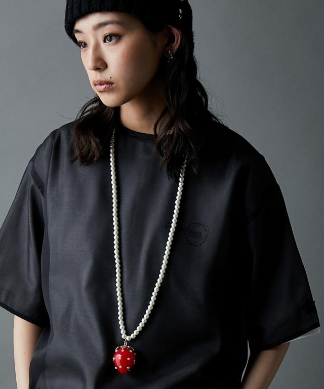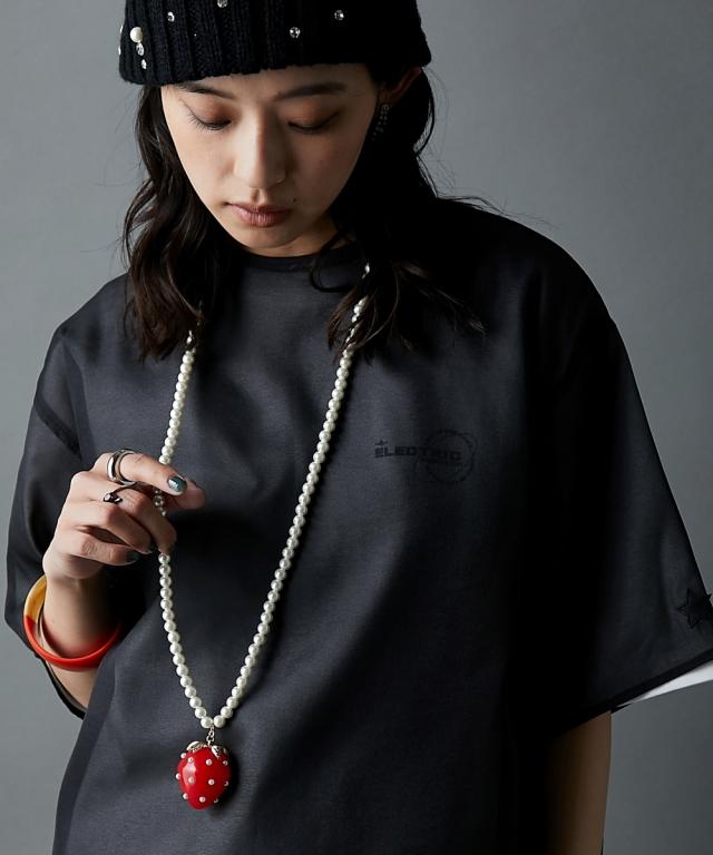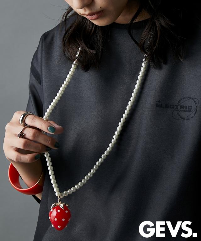 ボリュームのあるイチゴモチーフがポイントのネックレス。 柄やロゴ入りのカジュアルトップスとも相性が良く、イチゴの赤をコーデの差し色として映えさせてもGOOD ■仕様 パール調のビーズ部分はリアルパールに近いテリ感が出やすいパール調ガラスビーズを使用し、高見えに仕上げました。 約8cmの長さを調節可能なアジャスター付 ■デザイン 特徴的なイチゴモチーフはGEVS.オリジナル! 人とかぶりにくく、かっこよくも可愛くもなれるデザインネックレスです。