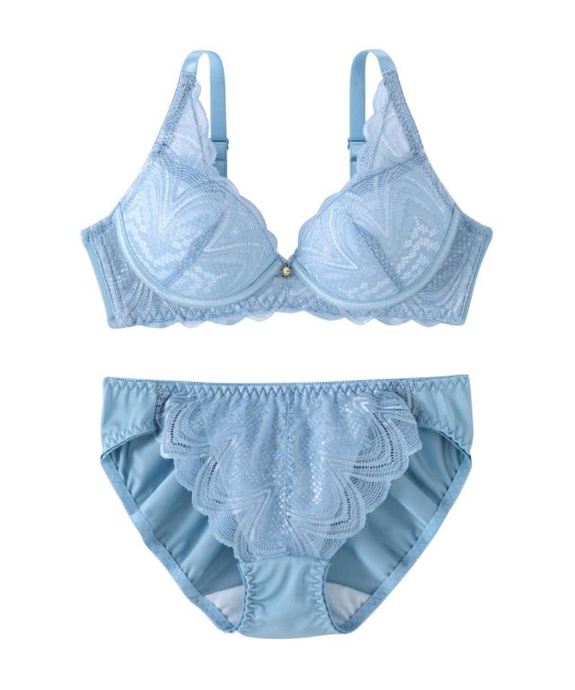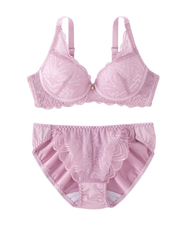ノンワイヤーなのにバストきれいなブラ・ショーツセット ・幾何調のストレッチレースを大人カラーで仕上げ、どことなくインポートのセクシーさを感じるデザイン。 ・キラキラ光に反射するレースとワイヤーループがおしゃれ。 ・下厚モールドカップでバストをプッシュアップ! ・カップ裏パネルが横の拡がりを防止し、ノンワイヤーでも美しい谷間をメイクしてくれます。 ・バック身生地は縦横に伸縮するのでほどよくフィットして気持ちのいいはき心地です。
