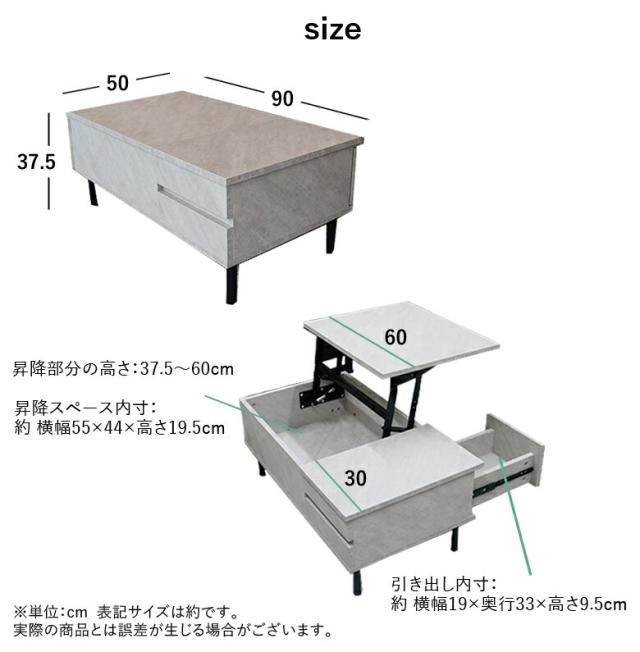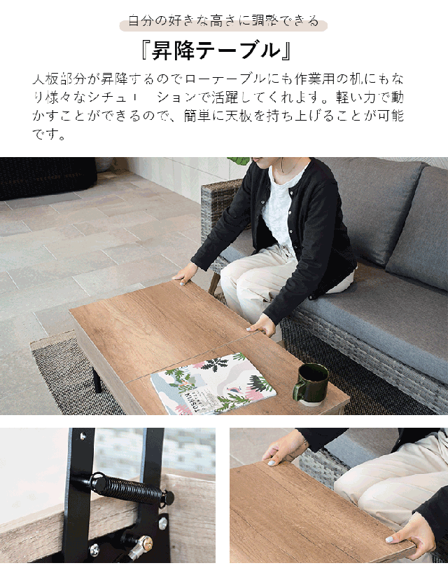 ・昇降部分の天板は37.5cmまたは60cmで使用できるので、ローテーブルとしてティータイムを楽しんだり、天板の高さを上げるとパソコン作業やライティングにも最適です。