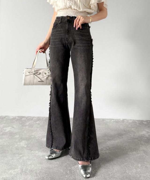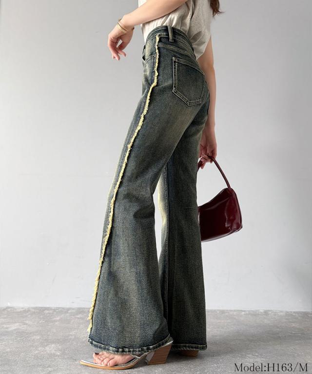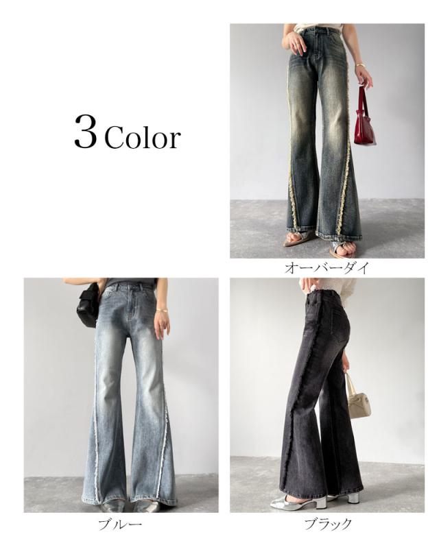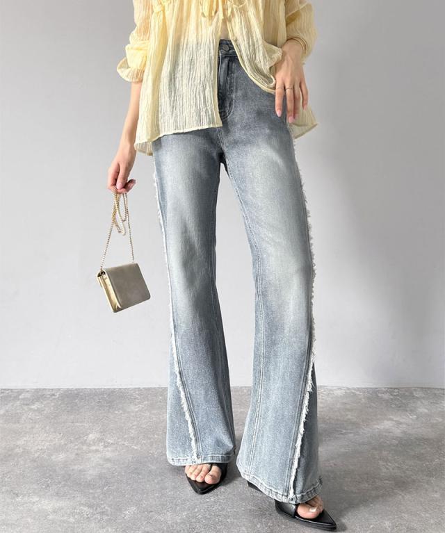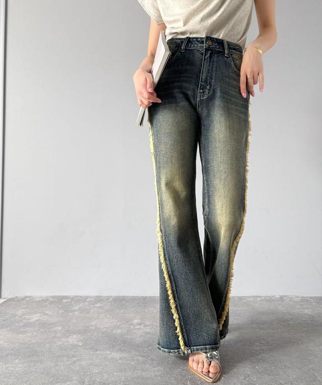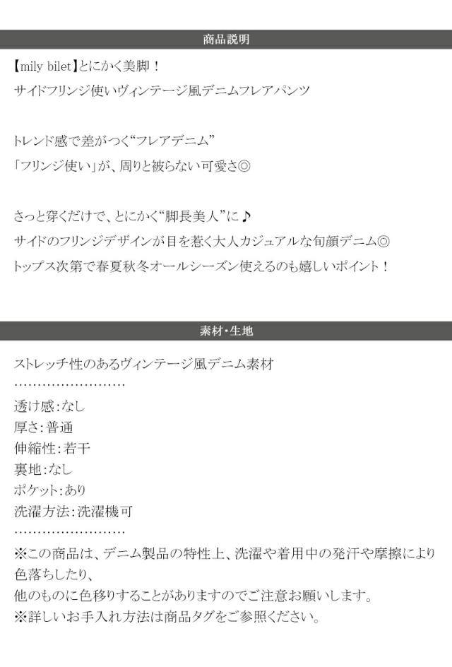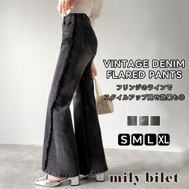 クラシカルエルフ秋新作 mily bilet ボトムス パンツ レディース サイド フリンジ 使い ヴィンテージ 風 デニム フレアパンツ ハイウエスト スタイルアップ ロングシーズン 大きいサイズ 2025ss mi0909006
