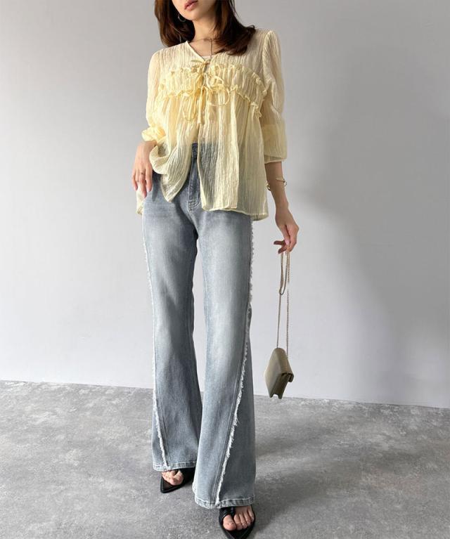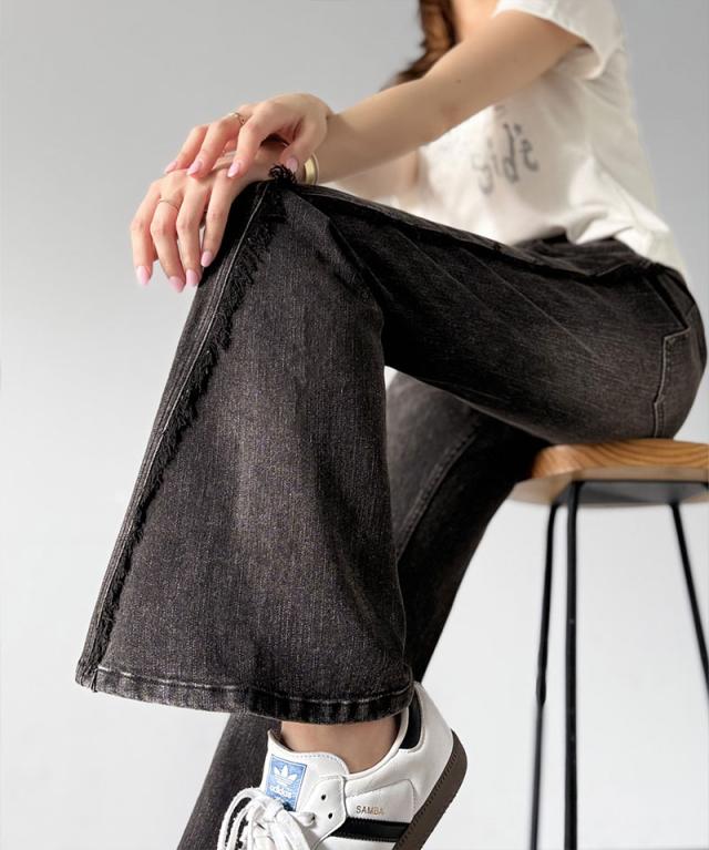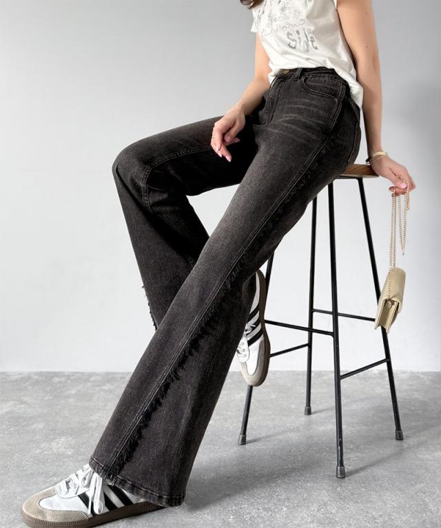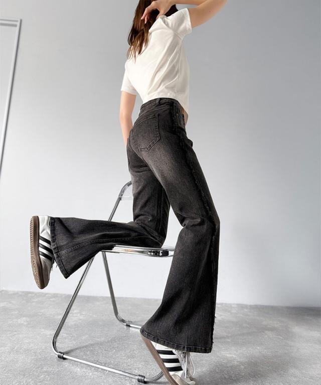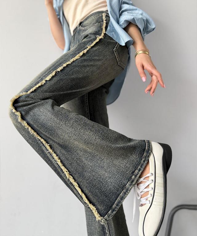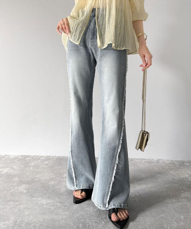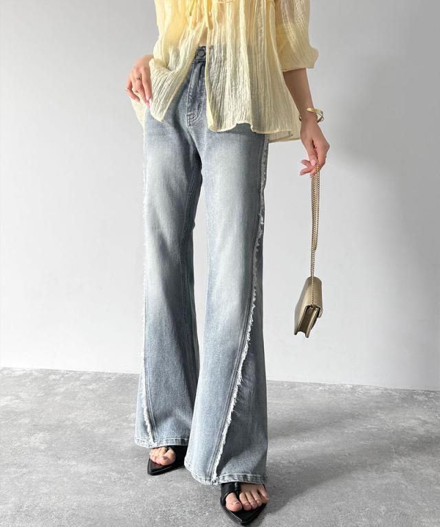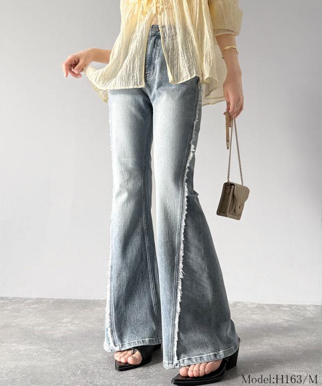 クラシカルエルフ秋新作 mily bilet ボトムス パンツ レディース サイド フリンジ 使い ヴィンテージ 風 デニム フレアパンツ ハイウエスト スタイルアップ ロングシーズン 大きいサイズ 2025ss mi0909006