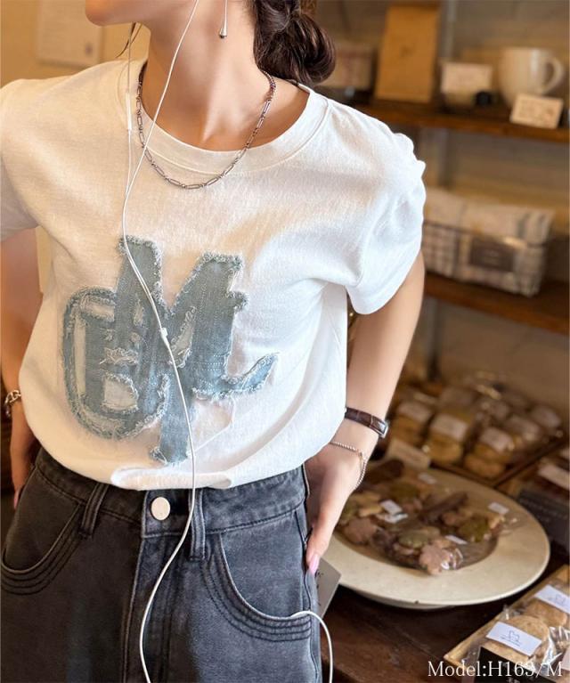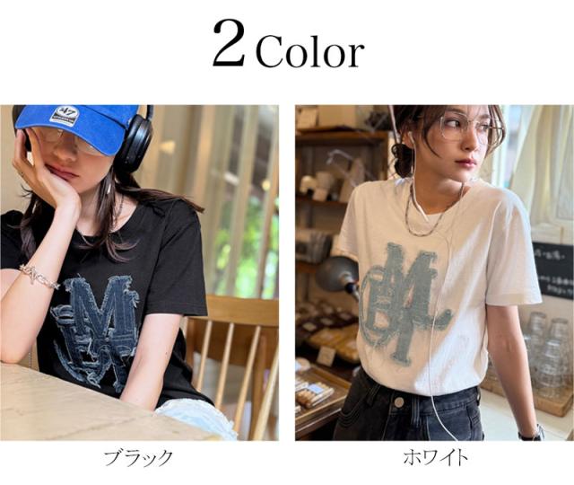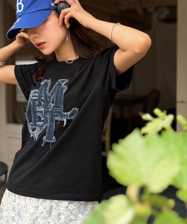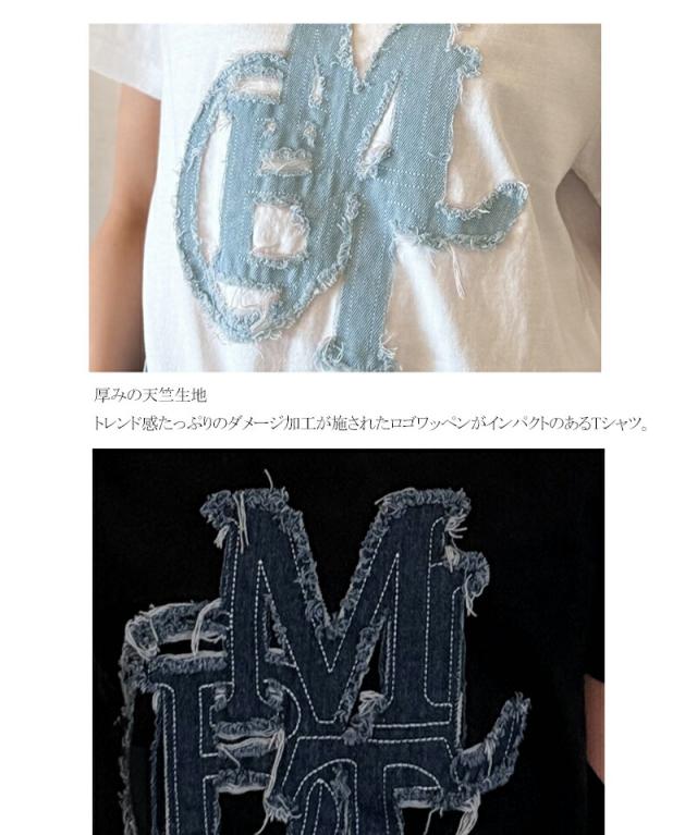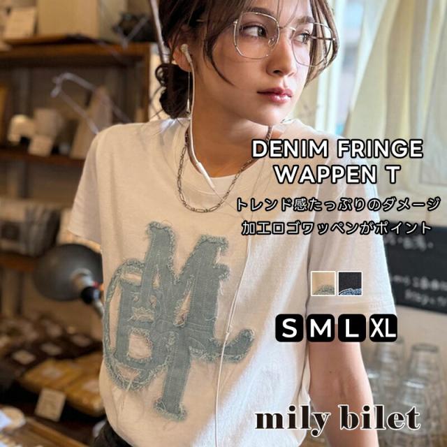 クラシカルエルフ秋新作 mily bilet トップス Tシャツ レディース デニム フリンジ ダメージ加工 ワッペン使い Tee 厚み 天竺 生地 ゆるっと オーバーサイズ 着回し 大きいサイズ 2025ss mi1329037