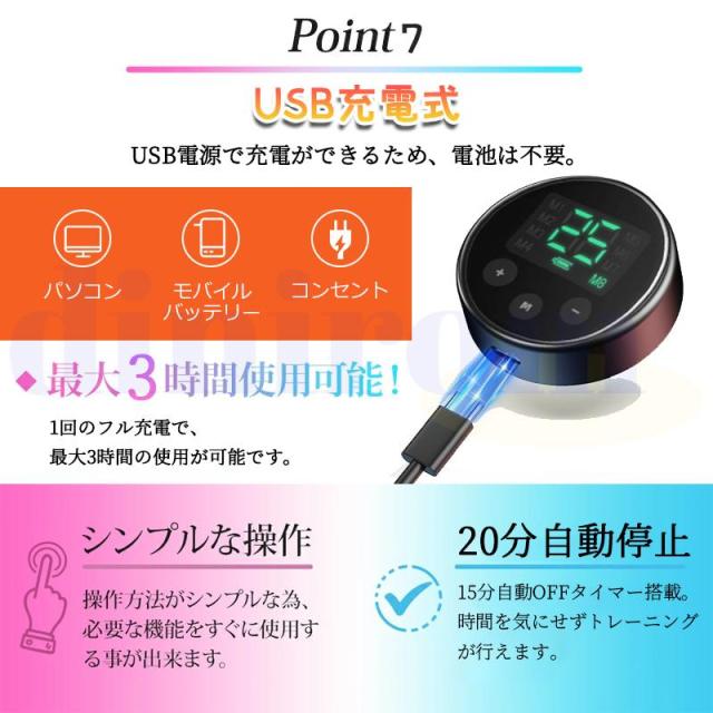 コードレスで使用できるという便利なEMSマシンで、電池交換不要の充電式を採用され、一度フル充電の状態で、20時間ぐらい使えます。腹筋トレーニング器具は付属のコントローラーは液晶画面が搭載して日本語の液晶画面でモード、強度を表示されます、身体に装着して使用時に、作動している状態(モードの種類、段階の強度)を見て確認できます、もっと安心に、もっと明瞭にトレーニングが楽しめます。
