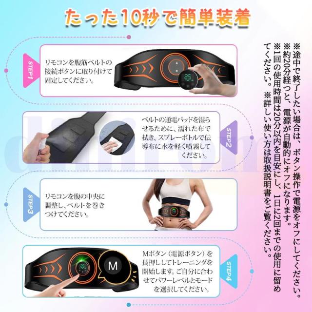 モード8種類、目的に合わせて強さを25段階で調整可能です。20分間自動オフ機能が搭載されるので時間をお気になる必要がありません。腹筋ベルトで20分の運動量はジョッキング2000m、自由泳40分、腹筋鍛え40分にあたります。初心者にも女性にも、特にサラリーマンや運動不足の方にも需求に満足し、簡単にトレーニングできる理想な鍛錬器具です。