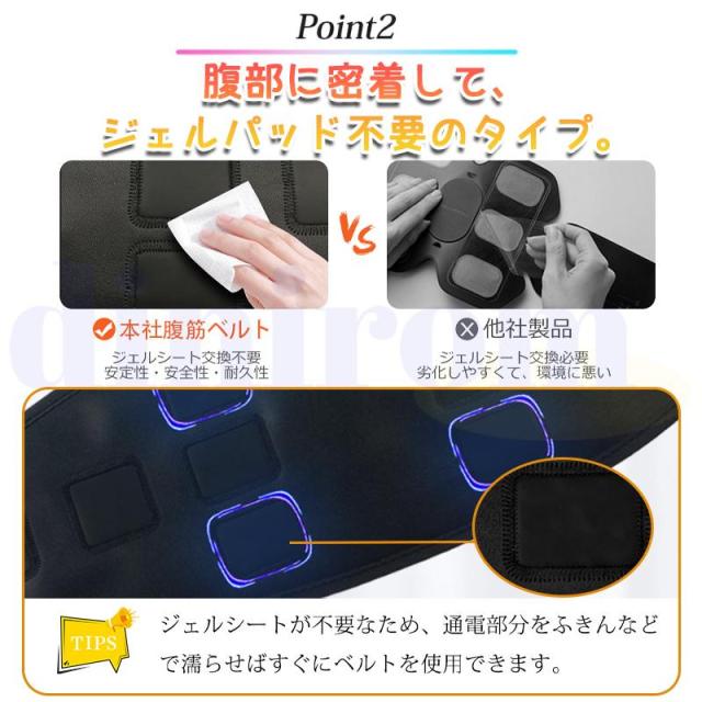 ジェルシートを定期的に交換する必要がないため、ランニングコストがかかりません。ご使用前、通電パッドを硬く絞った濡れ布巾で拭きいただくだけで長時間の通電が可能です。柔軟性の高いソフトなPU素材、12枚高電導のパッドを採用して、腹直筋以外に腹斜筋にも集中的に刺激を届けれます。なかなか落ちないお腹周りの肉を、知らない間に落としてくれる。