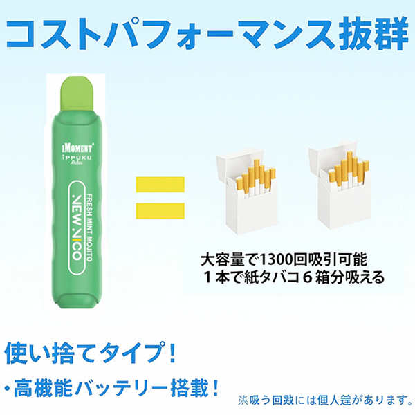 大容量で1300回吸引可能。1本でタバコ約6箱分。