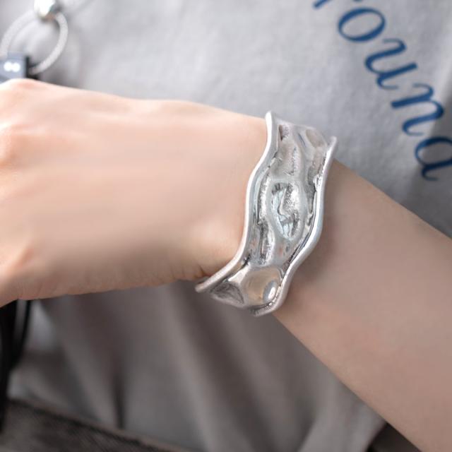 ニュアンスのあるクラフト調バングル。ヴィンテージ風のセミマットな質感で、幅広でもコーデに馴染みやすいデザインです。シンプルなTシャツやワンピースにも似合うから春夏コーデのアクセントとして活躍間違いなし◎