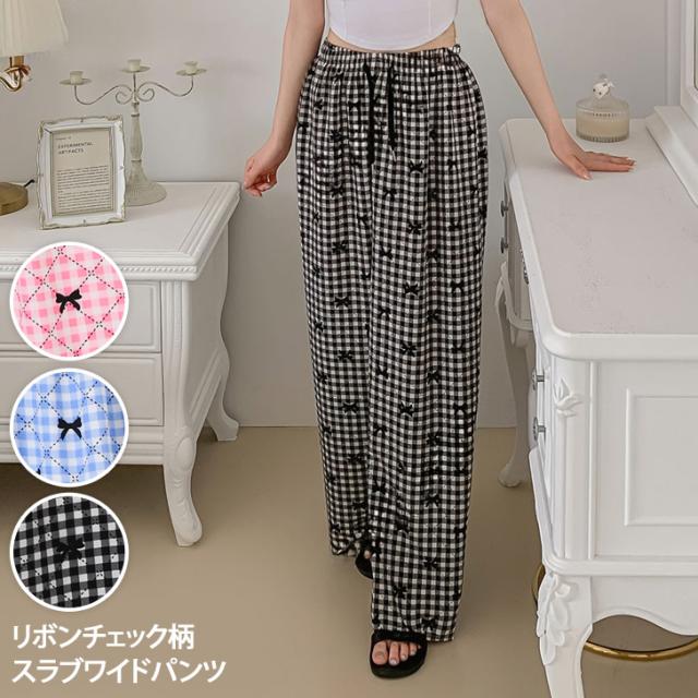 新作 リボンチェック柄ドローストリングフルレングススラブワイドパンツ レディース ボトムス 夏 薄手 涼しい 涼感 速乾 ロング丈 ウエストゴム ハイウエスト ゆったり おしゃれ 可愛い 韓国ファッション 楽ちん