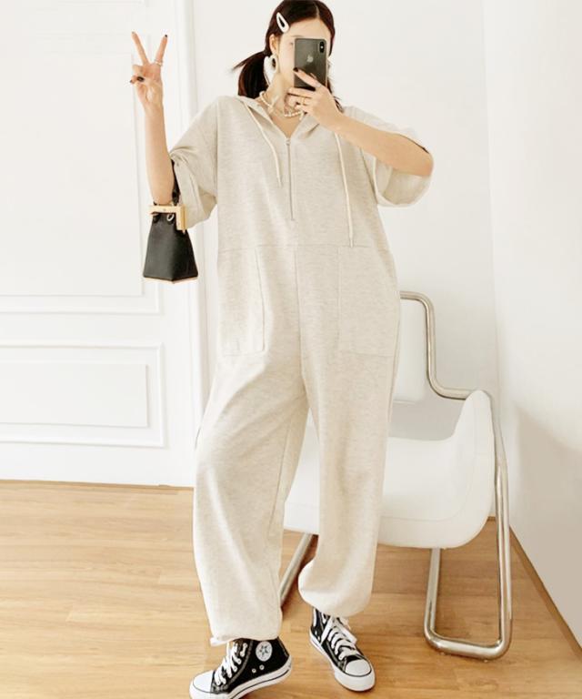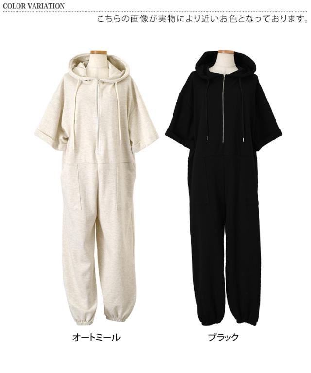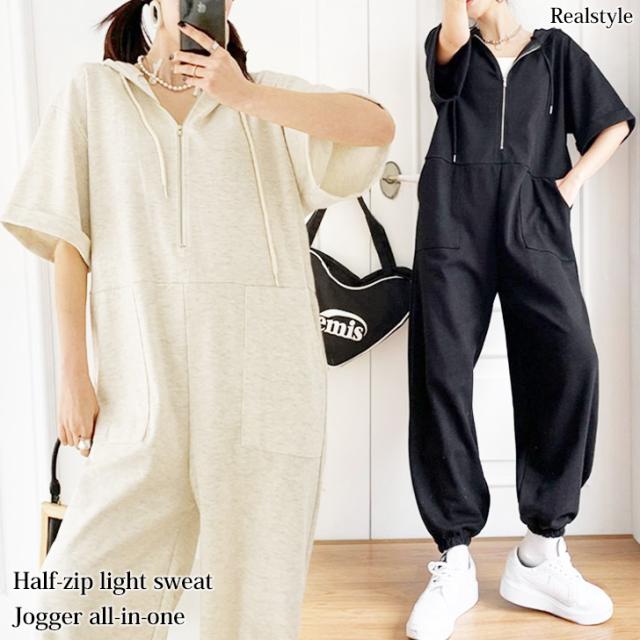 新作 ハーフジップライトスウェットベイカーポケットジョガーオールインワン レディース 半袖 ロング丈 マキシ丈 ジョガーパンツ パーカー カジュアル ライトスエット ジャンプスーツ つなぎ ゆったり 大きいサイズ