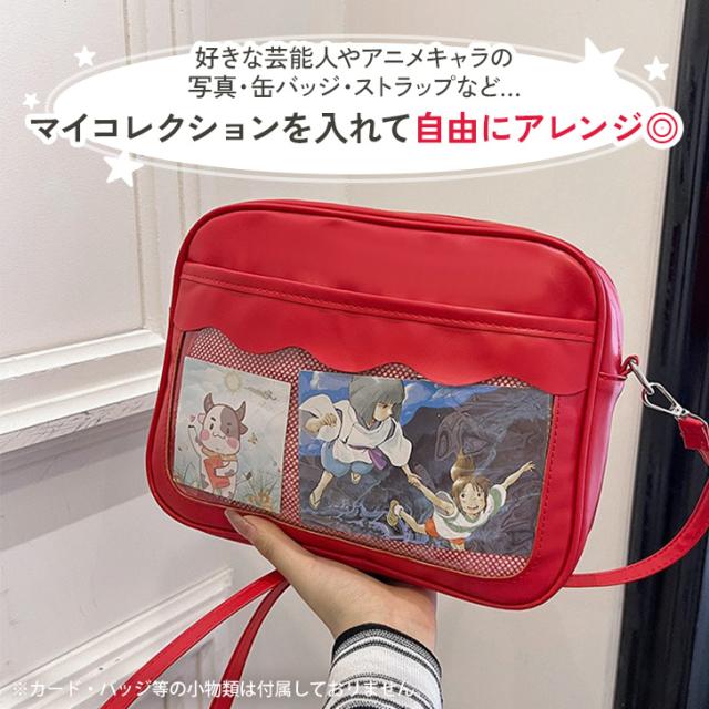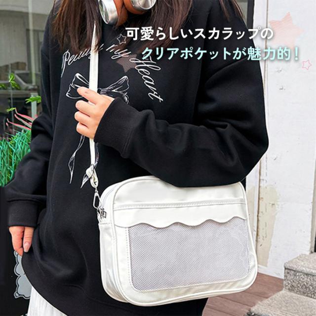新作 スカラップクリアポケット横型フェイクレザーショルダーバッグ レディース ショルダーバッグ 斜めがけバッグ 斜めがけ 肩掛け 軽量 マチ付き 収納 大人 痛バッグ 痛バ 推し活 ライブ コンサート 現場 缶バッジ
