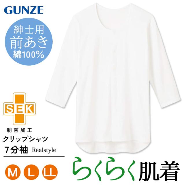 新作 GUNZE 愛情らくらく 綿100% 7分袖 クリップシャツ 前あき HWC118 SEKマーク インナー メンズ 下着 シャツ クルーネック トップス 肌着 制菌 柔らか 介護 入院 病院 診察 デイリー
