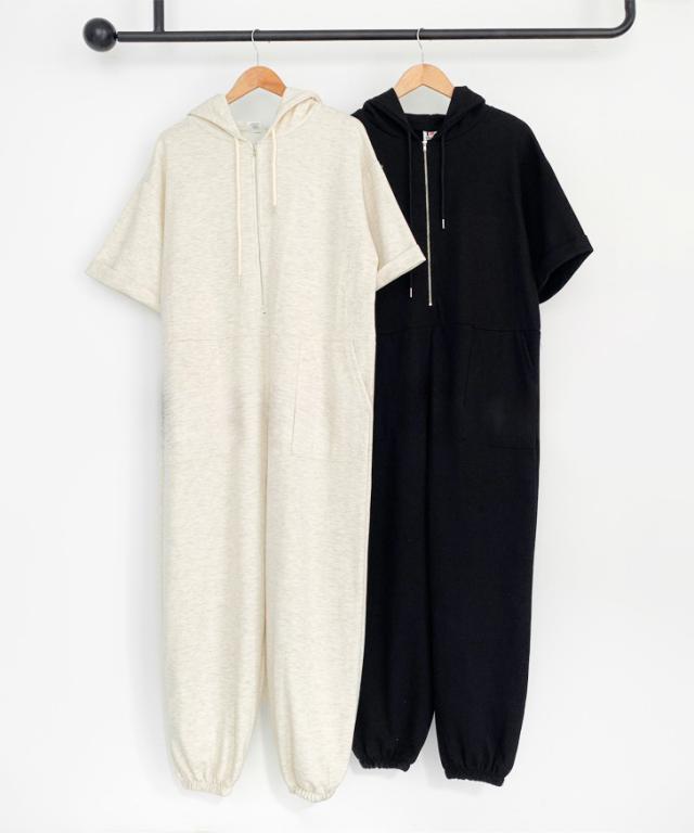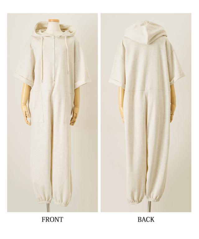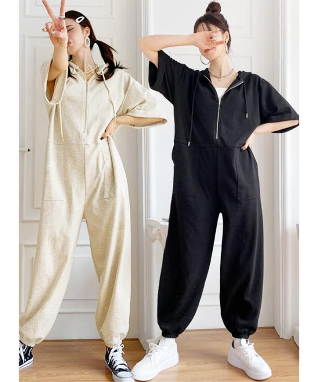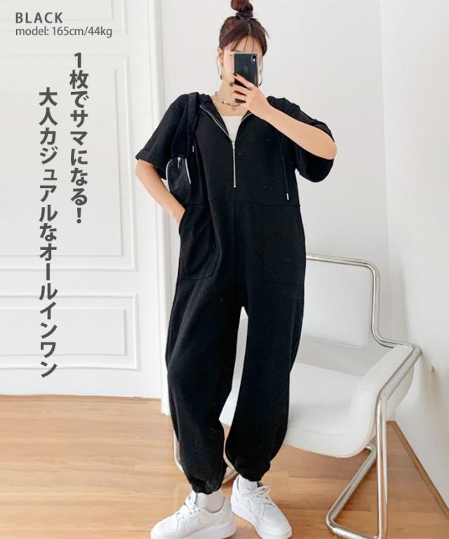 新作 ハーフジップライトスウェットベイカーポケットジョガーオールインワン レディース 半袖 ロング丈 マキシ丈 ジョガーパンツ パーカー カジュアル ライトスエット ジャンプスーツ つなぎ ゆったり 大きいサイズ