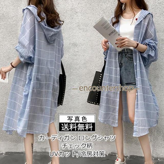 カーディガン レディース ロングシャツ チェック柄 アウター カジュアル UVカット 紫外線対策 冷房対策 薄手 フード付き きれいめ おしゃれ