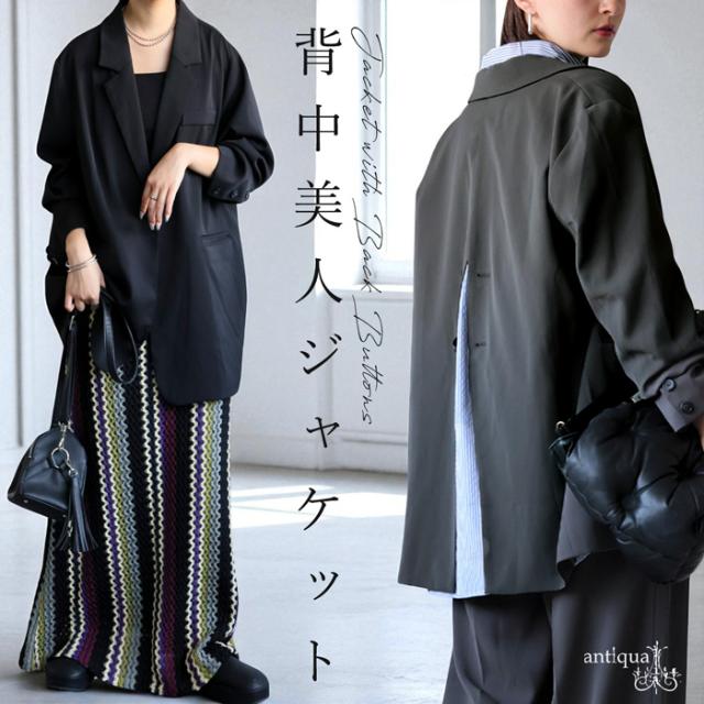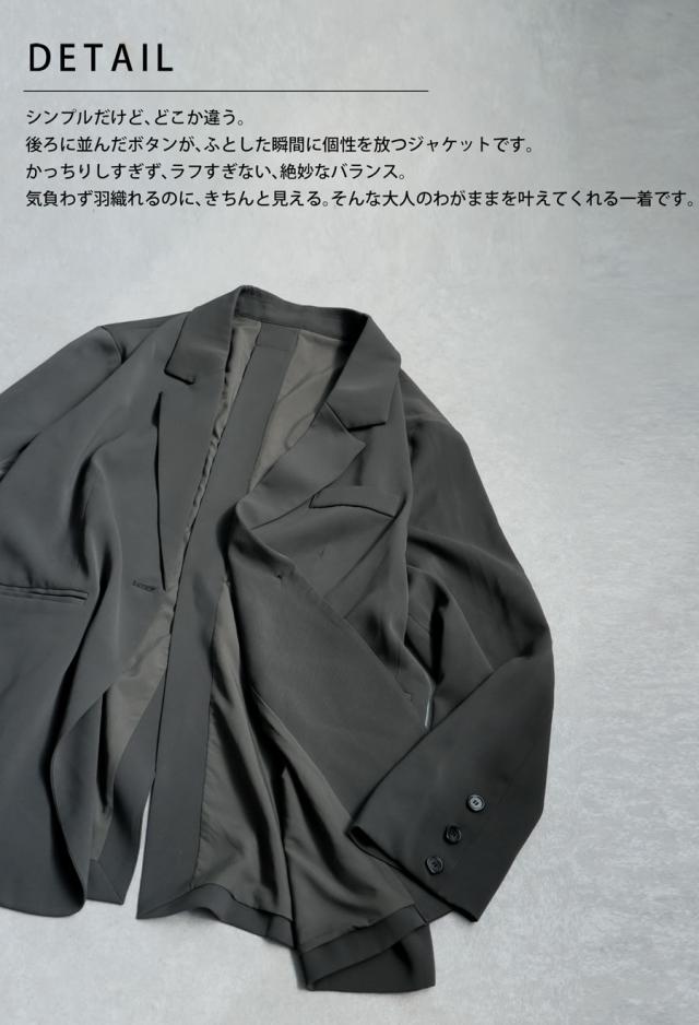 一見シンプルながら、後ろ姿に差がつくバックボタンデザインが魅力のレディースジャケットです。