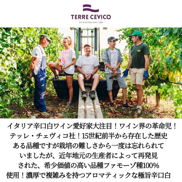 イタリア辛口白ワイン愛好家大注目!ワイン界の革命児!テッレ・チェヴィコ社!15世紀前半から存在した歴史ある品種ですが栽培の難しさから一度は忘れられていましたが、近年地元の生産者によって再発見された、希少価値の高い品種ファモーゾ種100%使用!濃厚で複雑みを持つアロマティックな極旨辛口白