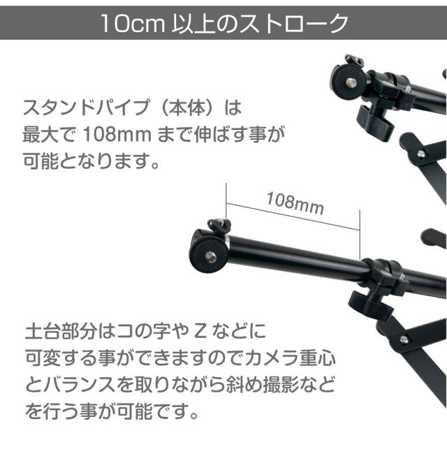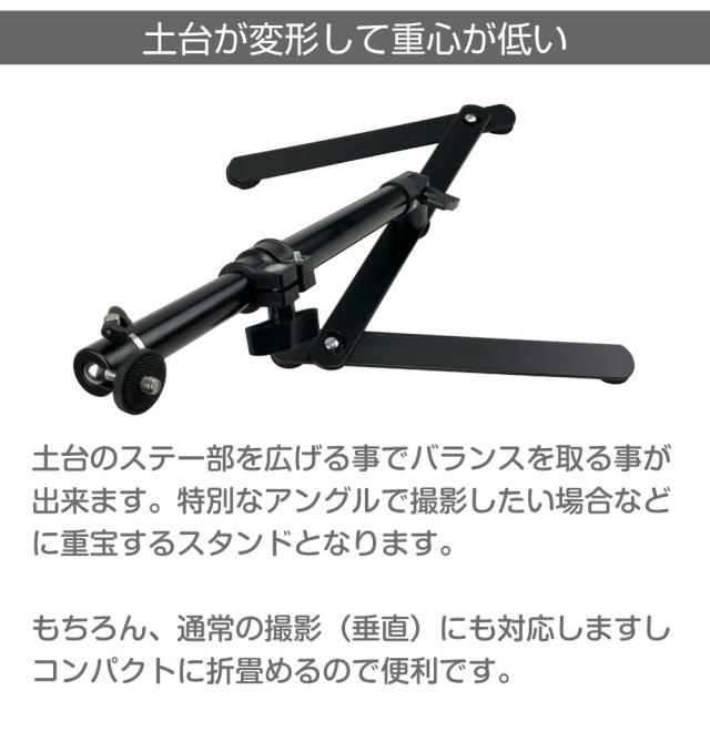 俯瞰撮影などに便利なコの字型台座のカメラスタンドです。 機材、設置個所に合わせて台座を自在に調整することができます。 アームも可動箇所が多く様々な角度に調整が可能です。 コンパクトなので卓上での撮影に向いてます。 |