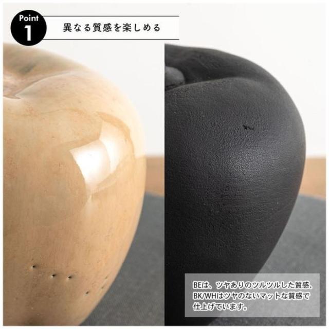 ●陶器製のフルーツモチーフオブジェ。●置くだけで絵になるフォルムと、色んな場所に取り入れやすいサイズ感が魅力。●ベージュカラーはツヤありのツルツルとした質感。●ブラックとホワイトはツヤのないマットな質感。●裏面には滑り止め付き。●ちょっと置いておくだけで雰囲気のあるディスプレイに。※陶器製品の為、個体差があります。