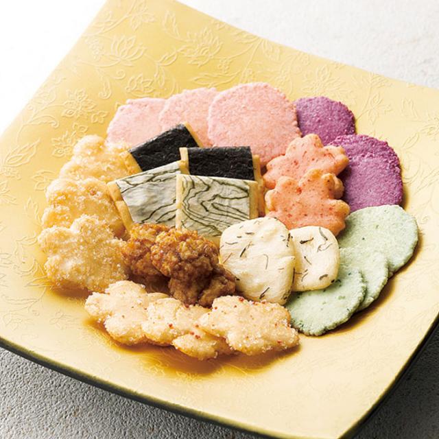国産もち米・うるち米を使用した、四季の彩りを映したあられと、知多半島産えびを使用した香ばしいえびせんの詰め合わせ。海苔巻や梅、昆布、カレー味など、風味豊かなバリエーションと、さくらや季節のモチーフをかたどった見た目にも楽しい逸品です。素材の良さと職人の技が光る、贈り物にも喜ばれる和のスナックギフトです。