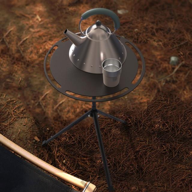 天板はアルミニウム合金を使用、三脚部は鉄を使用し、丈夫で高耐久なデザインとなっています。テーブル表面は静電塗装で傷がつきにくく、見た目も洗練されています。どんなキャンプ用品にも合わせることができます。テントの内外、室内、焚き火の周り、あらゆる場所で使用可能です。