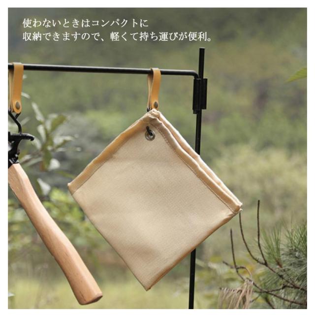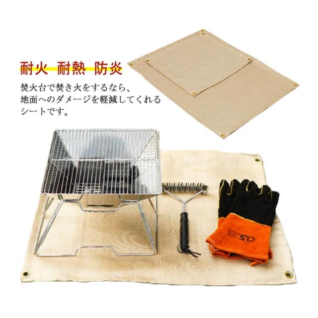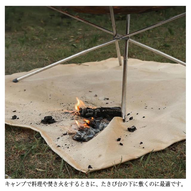 | 焚火台で焚き火をするなら、地面へのダメージを軽減してくれるシートです。 耐熱性が高いガラス繊維素材で作られており、地面や芝生などへのダメージを防ぐことができます。 焚き火シートは穴があります、鍛造ペグで固定できで、強風でも安心してお使いいただけます。 使わないときはコンパクトに収納できますので、軽くて持ち運びが便利。 キャンプで料理や焚き火をするときに、たきび台の下に敷くのに最適です。 | |