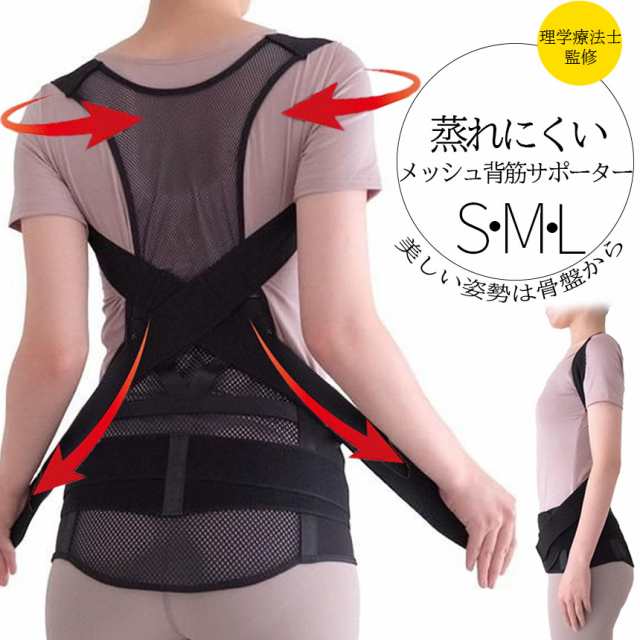骨盤からととのえる メッシュの背筋サポーター理学療法士監修簡単補正 骨盤を整え、背筋をピンッと伸ばす姿勢補正サポーターです●サポーターの使い方Point1 たすき掛けの肩ベルトが肩甲骨を背中心に引き寄せるPoint2 スライドベルトを引っ張ると胸が開き本来の正しい姿勢に。背筋をお好みの強度で伸ばします。肩紐部分が抜け落ちない仕様ですPoint3 しっかり二重ベルト付き骨盤ベルトが骨盤を起こし、しっかり支えて上半身を安定させます