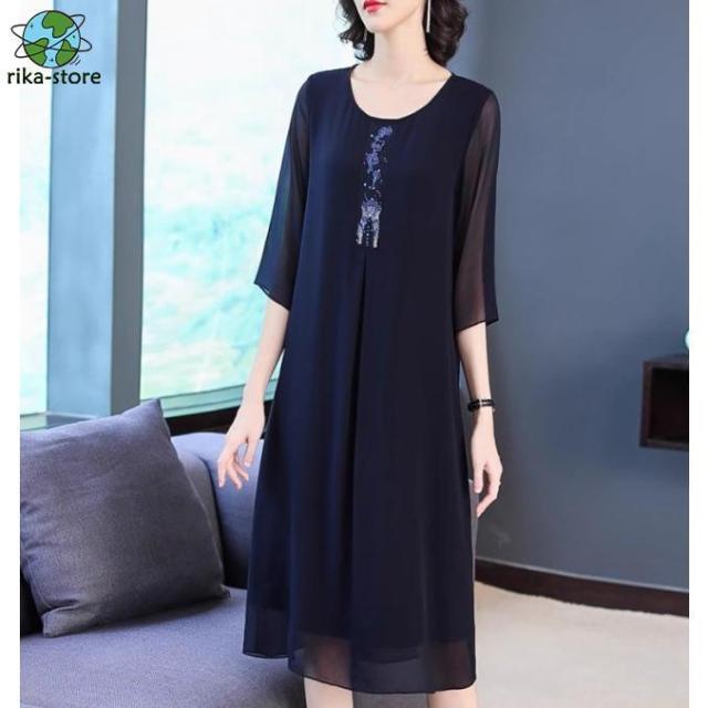 パーティードレス 結婚式 服装 女性 お呼ばれドレス 50代 40代 30代 ワンピースドレス Aライン 袖あり 五分袖 膝下丈 シアー袖 大きいサイズ 3L 4L 5L シンプル 丸首 ラウンドネック 上品 きれいめ カジュアル ミセス