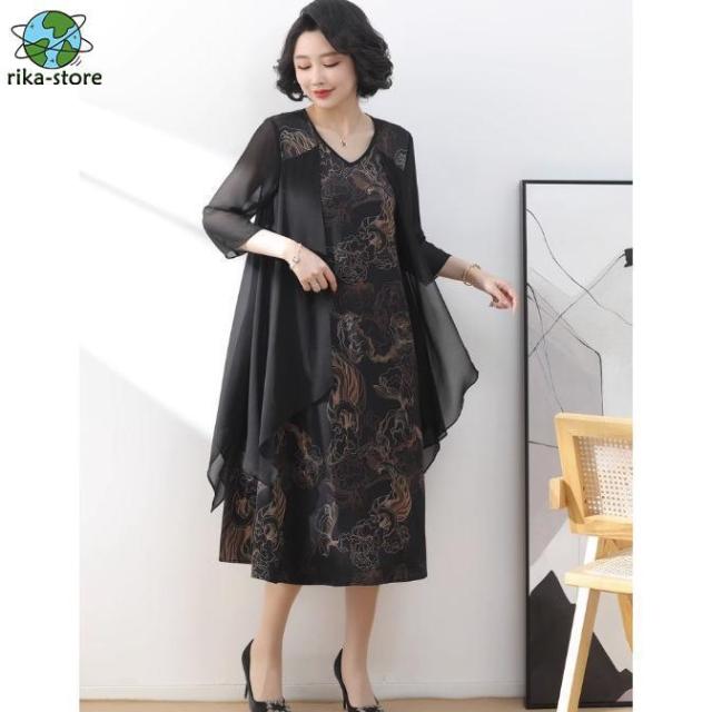ワンピースドレス 50代 60代 パーティードレス 結婚式 お呼ばれドレス 50代 大きいサイズ 3L 袖あり 七分袖 重ね着風 ミモレワンピース ロング丈 シアー Vネック