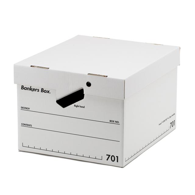 703ボックスの2倍以上の耐荷重性能を誇るバンカーズボックスシリーズのフラッグシップモデルで、たった1秒で本体の組み立てを可能にする”Presto(TM)”を採用しています。斜めにカットされたユニークな”エルゴハンドル”は持ち運びの際に手首への負担を軽減し、圧倒的な持ちやすさを実現しました。ハンドル横の結束バンドホールは運搬時のフタ落下を防ぐだけでなく、中長期での保管に最適なセキュリティの役割を果たします。
