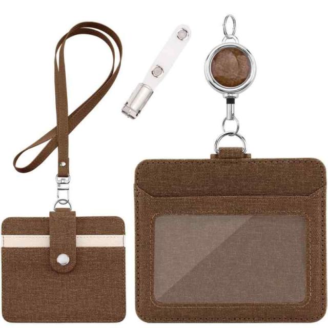 IDカードホルダー - 横型&縦型 IDカードケース ネームホルダー 両面用 名札 パスケース 胸ポケットクリップ&伸縮リール式 クリップストラップ付き (横型ブラウン)