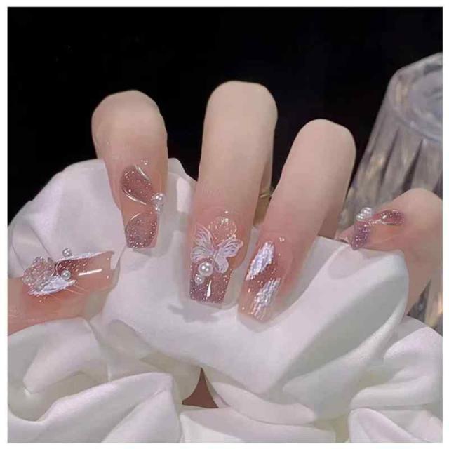 MISS MUMU ネイルチップ 24枚入 ネイルチップ ロング 春夏 シンプル かわいい おしゃれ 人気 ネイルシール 花嫁ネイル 光沢 つけ爪 成人式 結婚式 入学式 卒業式 パーティー できます (パールバタフライ-D492)