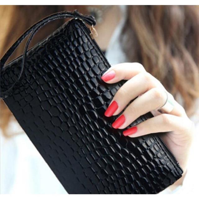 クロコダイル型のデザインがかわいい艶々感ある長方形のエナメルポーチです。