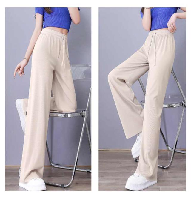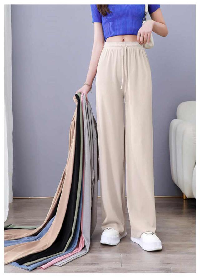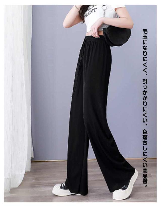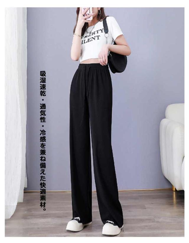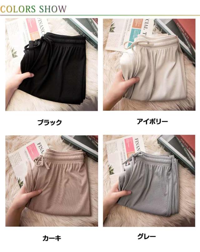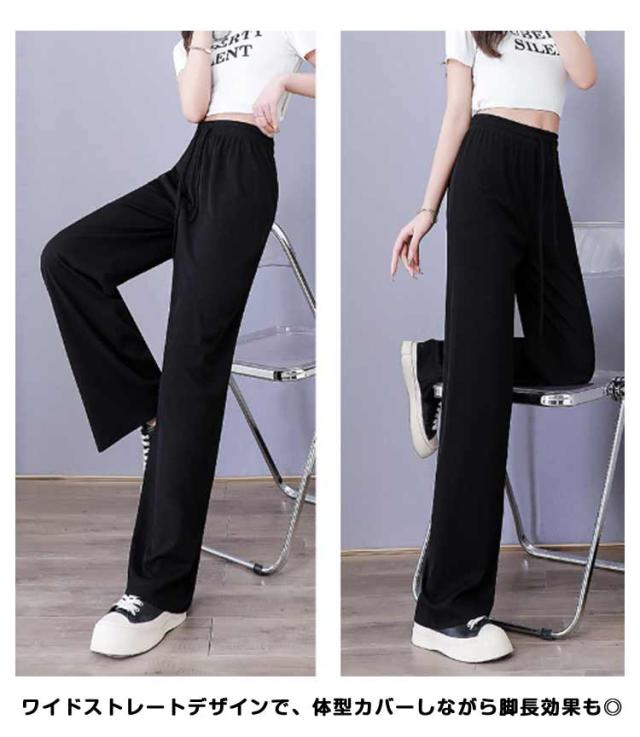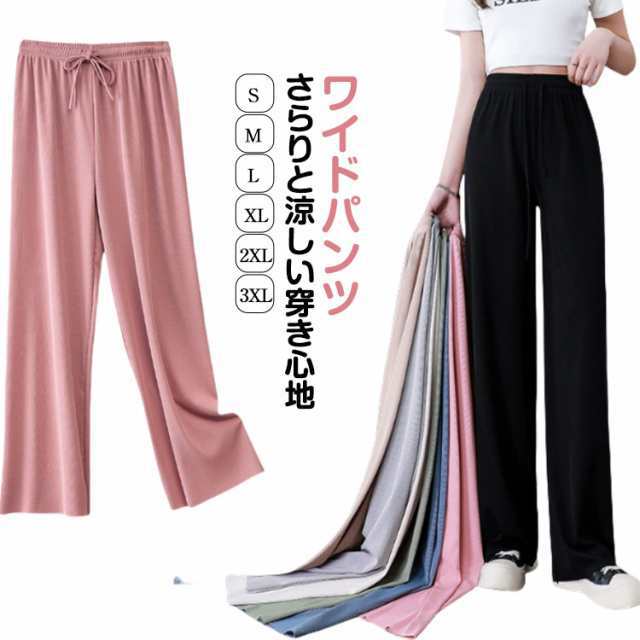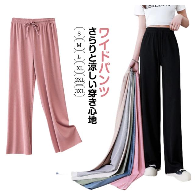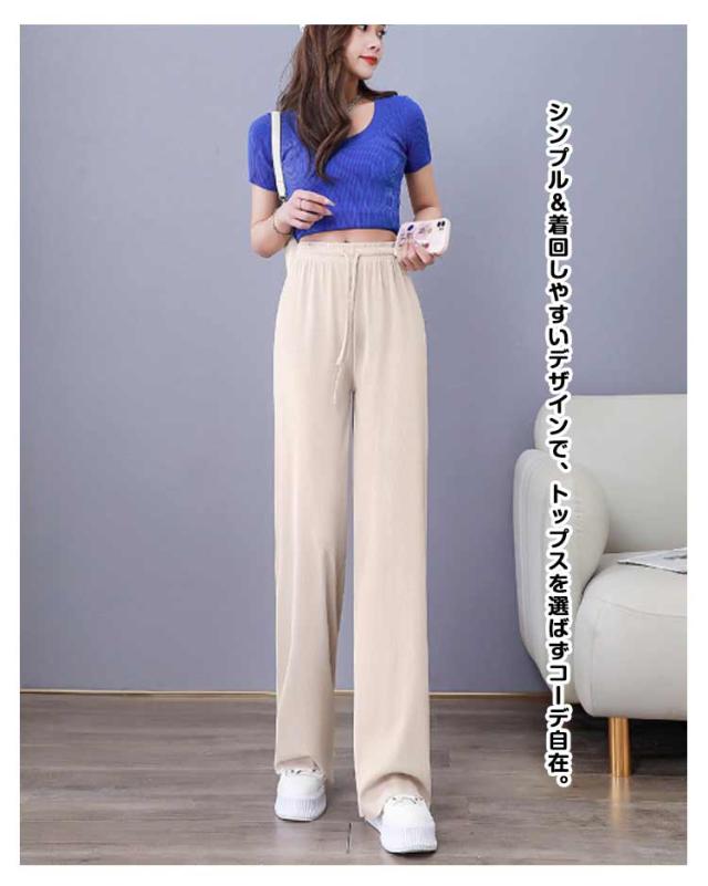 レディース 涼しい アイスシルク ロング ワイド 春・夏・秋に大活躍 アイスシルク ハイウエスト 美脚効果 ストレート 薄手 シンプル カジュアル ウエストゴム 柔らかい