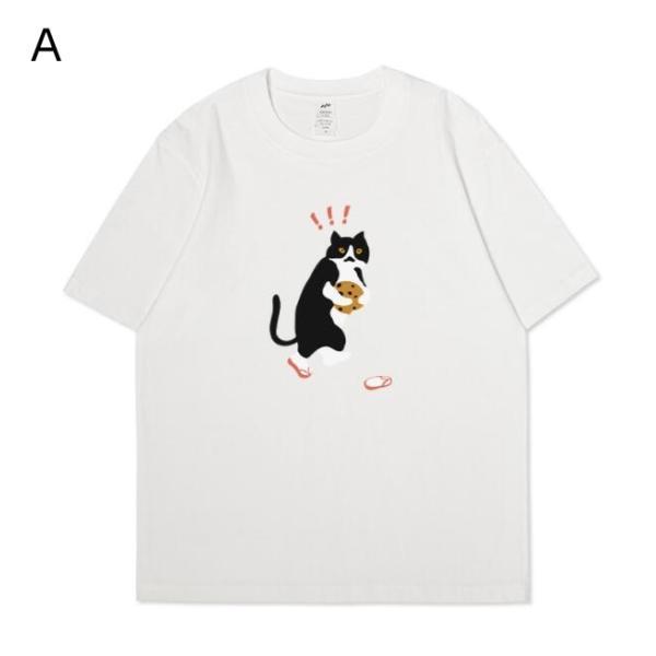 Tシャツ 半袖 メンズ レディース カープル お揃い 猫柄Tシャツ 夏 tシャツ ティーシャツ 夏服 ペアルック カットソー トップス クルーネック 黒 白