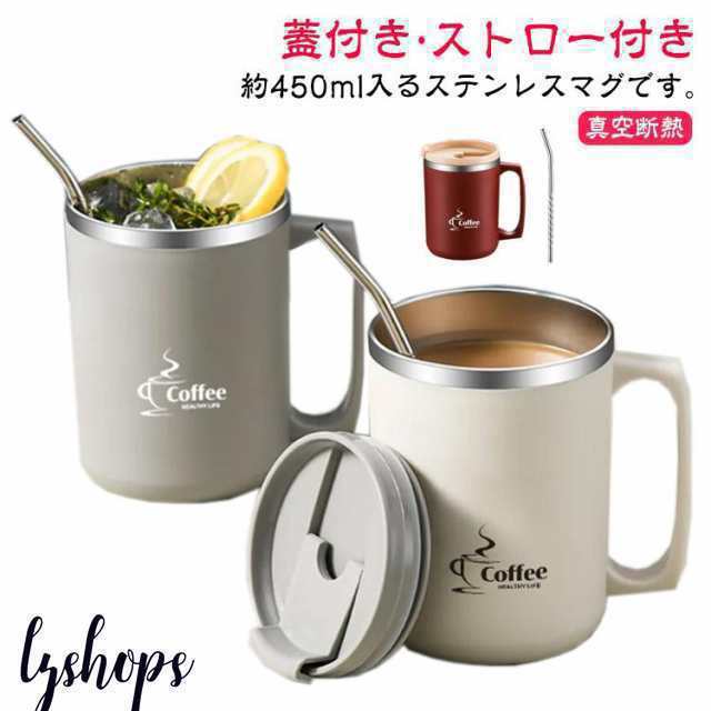 ステンレス マグカップ 蓋付き 保冷 保温 ステンレスマグ タンブラー ストロー付き 持ち手 コーヒーカップ コーヒーマグ 二重構造 真空断