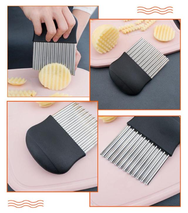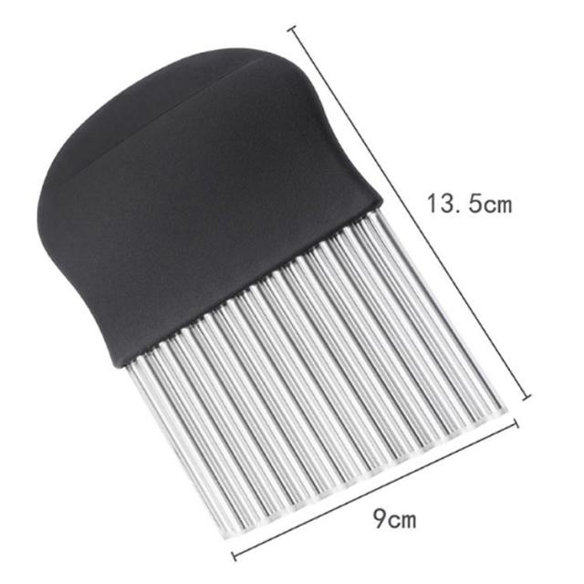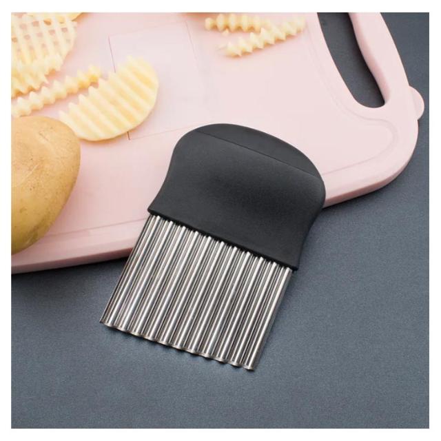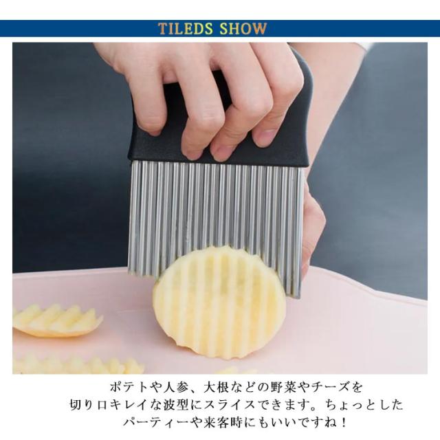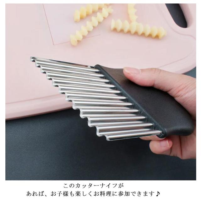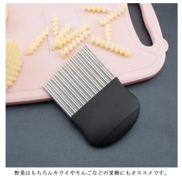 | ポテトや人参、大根などの野菜やチーズを切り口キレイな波型にスライスできます。ちょっとしたパーティーや来客時にもいいですね! お店のような素敵なカッティングが気軽にできちゃいます!じゃがいもをカットし揚げれば、なみなみフライドポテトに。 このカッターナイフがあれば、お子様も楽しくお料理に参加できます♪ 野菜はもちろんキウイやりんごなどの果物にもオススメです。 | |