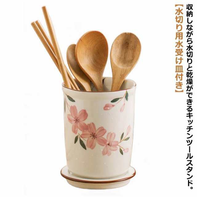 花柄 キッチンツールスタンド カトラリースタンド レードル キッチンツールスタンド 重厚感 さくら柄 おしゃれ 筒 ツールスタンド カトラリー入れ 陶器 キッチンツール収納 おたま 調理グッズ フライ返し 菜箸 入れ 箸立て 調理道具 収納 キッチン収納 桜