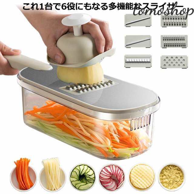 | これ1台で6役にもなる多機能なスライサー。 頻繁に料理する方、忙しい主婦の手助けになる便利なアイテムです。 指を守ってくれるホルダーつき。 ブレードは、おろし器、薄切り、厚切り、細切り、太切り、花型切りの6種類。 簡単に差し込むだけなので、めんどうくさがりの人でも刃の取り替えがラクラク。 調理時間を大幅に減らすことができ、面倒な工程が減るだけでなく、包丁だけでは難しい繊細な作業が可能になり、料理の幅が広がります。 そのため、忙しい主婦から料理初心者まで、自炊をするすべての方におすすめです。 | |