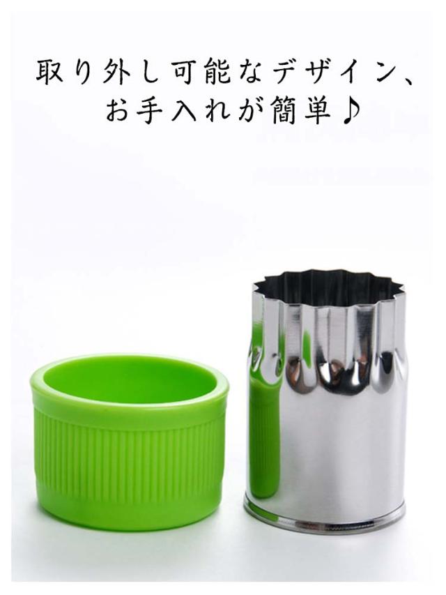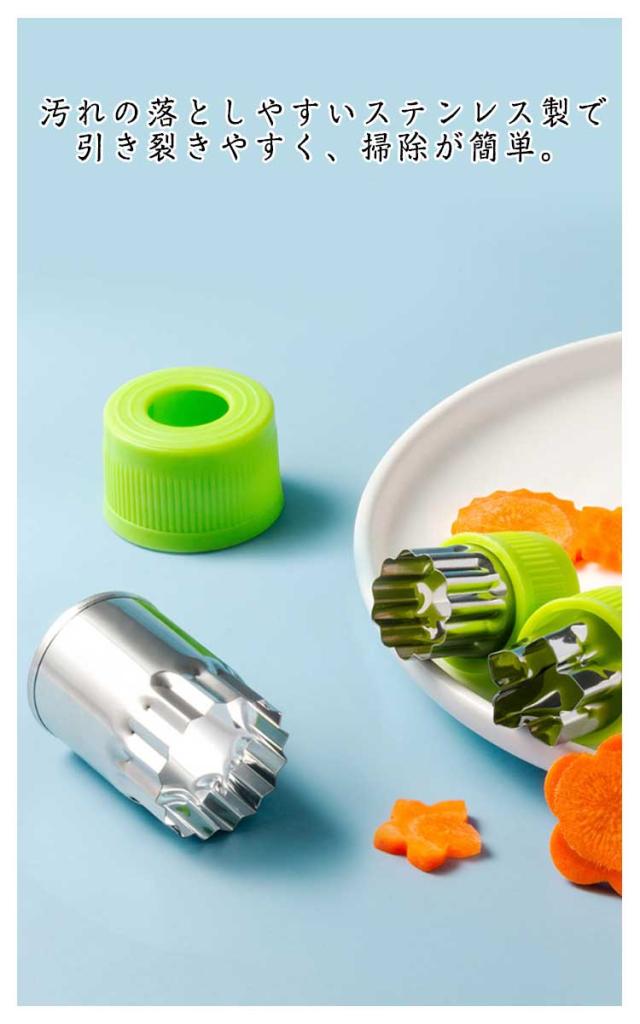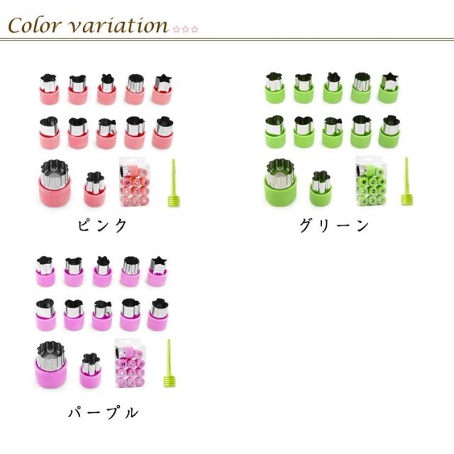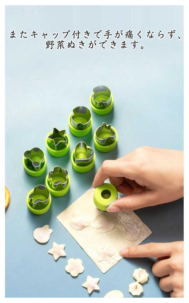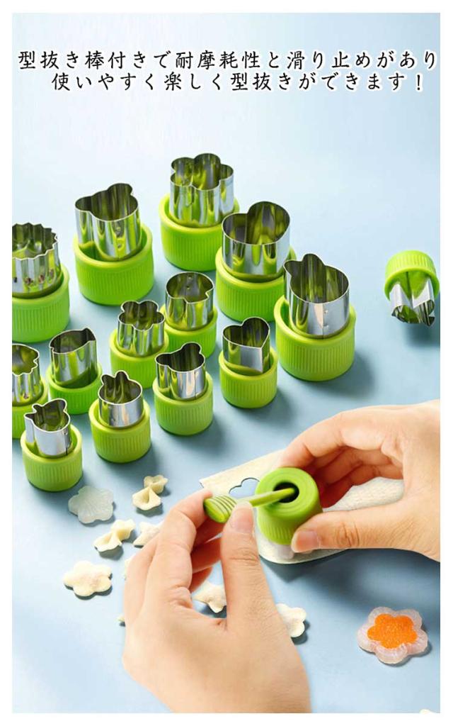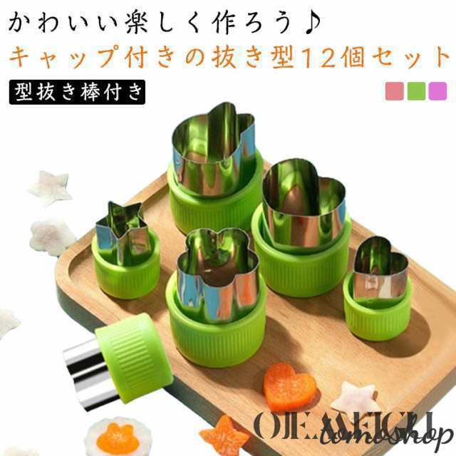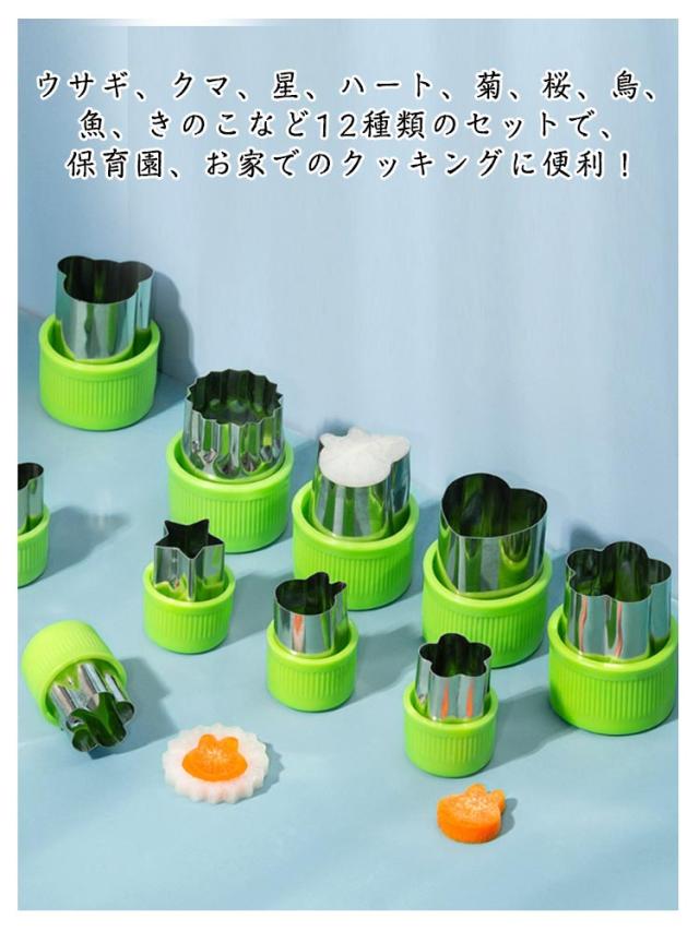 | かわいい楽しく作ろう? キャップ付きの抜き型12個セット 型抜き棒付き ウサギ、クマ、星、ハート、菊、桜、鳥、魚、きのこなど12種類のセットで、保育園、お家でのクッキングに便利! 型抜き棒付きで耐摩耗性と滑り止めがあり、使いやすく楽しく型抜きができます! またキャップ付きで手が痛くならず、野菜ぬきができます。 汚れの落としやすいステンレス製で引き裂きやすく、掃除が簡単。 透明な包装ケースで収納にもプレゼシトにも最適! | |