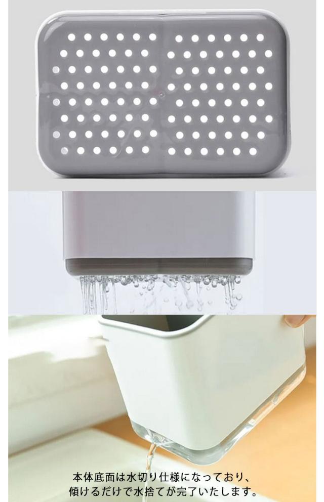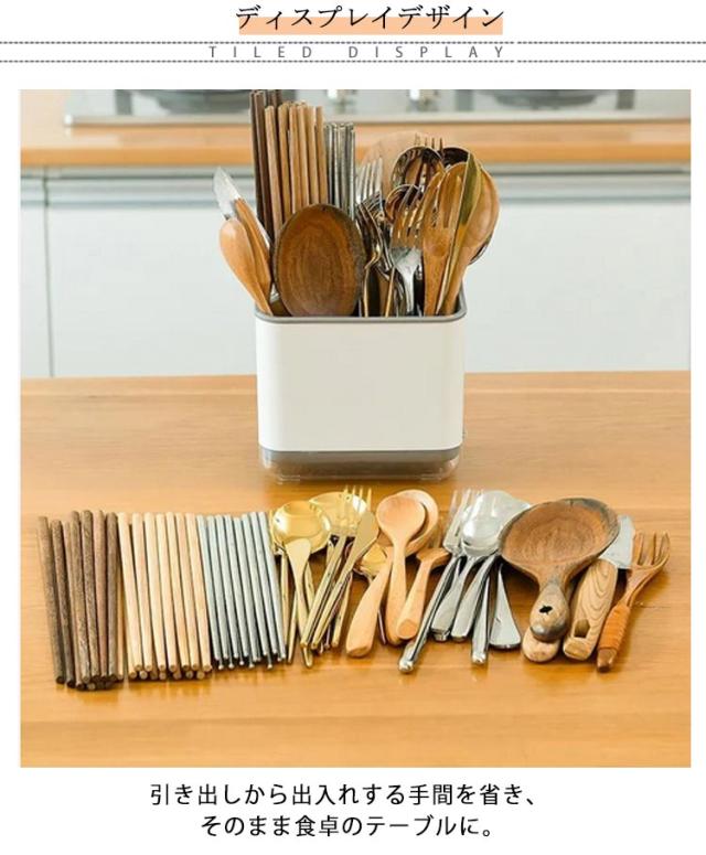 | インテリアに馴染むシンプルなデザインのカトラリースタンドです。 スタイリッシュカラー2色展開です。コンパクトながら収納力抜群。 仕切りデザインで箸やスプーンなどは分類して、すっきりと整頓されています。 手前と奥で深さが異なるデザインとなっており、長さの異なるカトラリーも大変取り出しやすくなっています。 本体底面は水切り仕様になっており、傾けるだけで水捨てが完了いたします。 また、底面パーツは簡単に取り外し可能。すみずみまでお掃除ができ常に清潔に保てます。 引き出しから出入れする手間を省き、そのまま食卓のテーブルに。 | |