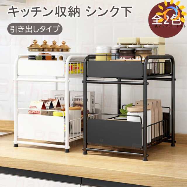 キッチン収納 シンク下 洗面台下 収納棚 2段落 引き出しタイプ 伸縮式 隙間収納 スライドトレー 小物置き 整理棚 キッチン用品 スチール製 ネジ不要 組立簡易