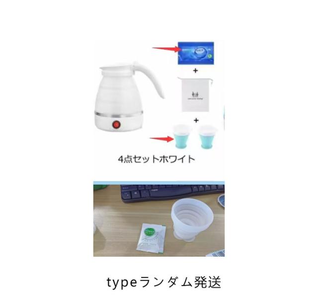| 【4点セット 電気ケトル*1、収納ポーチ*1、折りたたみ式コップ*2】 【安全安心素材】 【折りたたみ式】 【空焚き防止機能】 引っ張るだけですぐ使えます。 折りたためる部分は柔らかいシリコン製です。 使わないときは厚さわずか10cmに。 沸騰したら過熱を自動で停止。過熱しすぎの危険を防止します。 蒸発し中のお湯がなくなっても、空焚きをしないので安心です。 1~2人使いにちょうどいい600mlです。 蓋は持ち手のレバーを使い、直接触ることなく安心して開閉できます。 安心で安全な食品用シリコンです。 | |